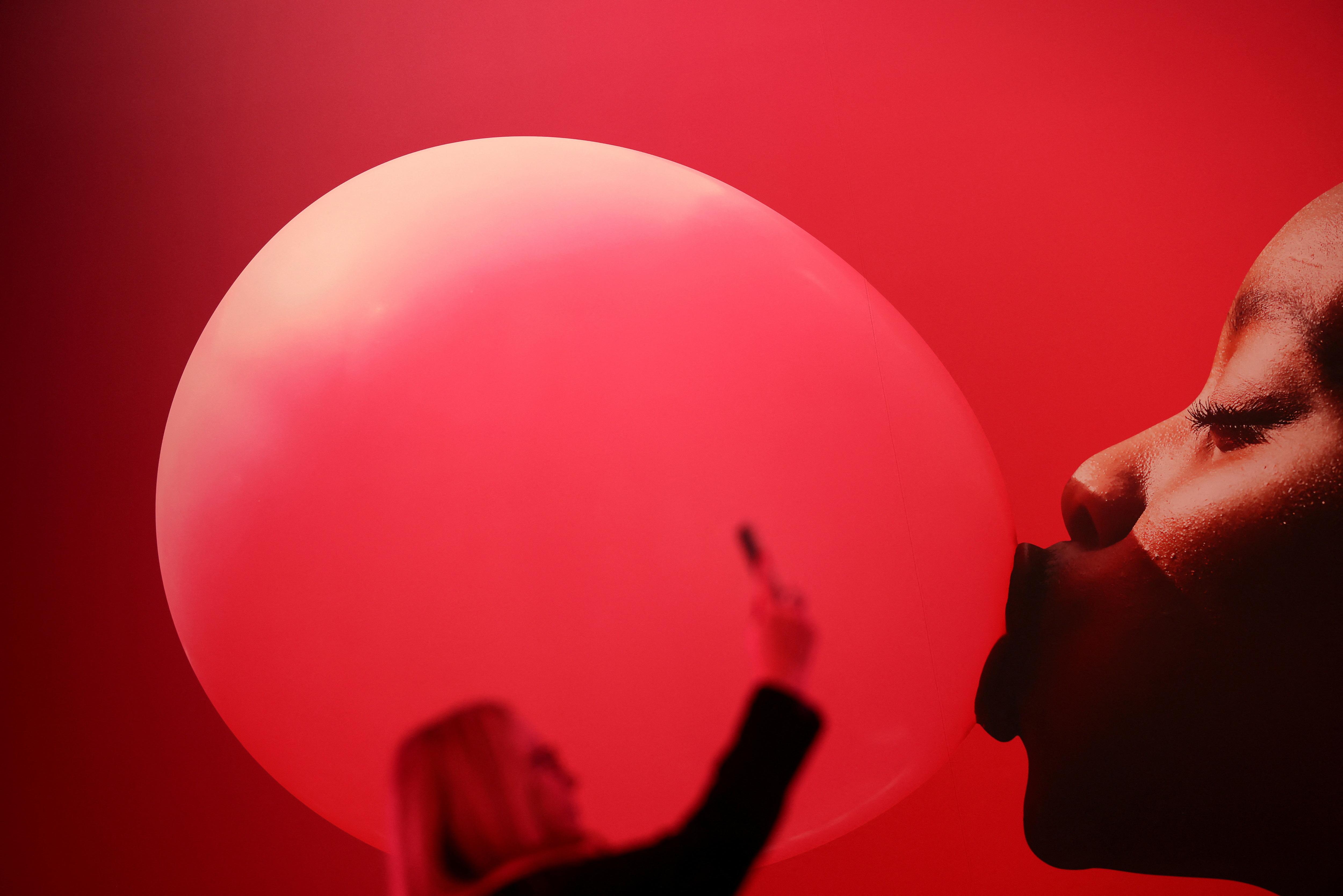 A woman holds up an electric device, during the GSMA's 2023 Mobile World Congress (MWC) in Barcelona, Spain on March 1, 2023. (Photo by Nacho Doce/Reuters)