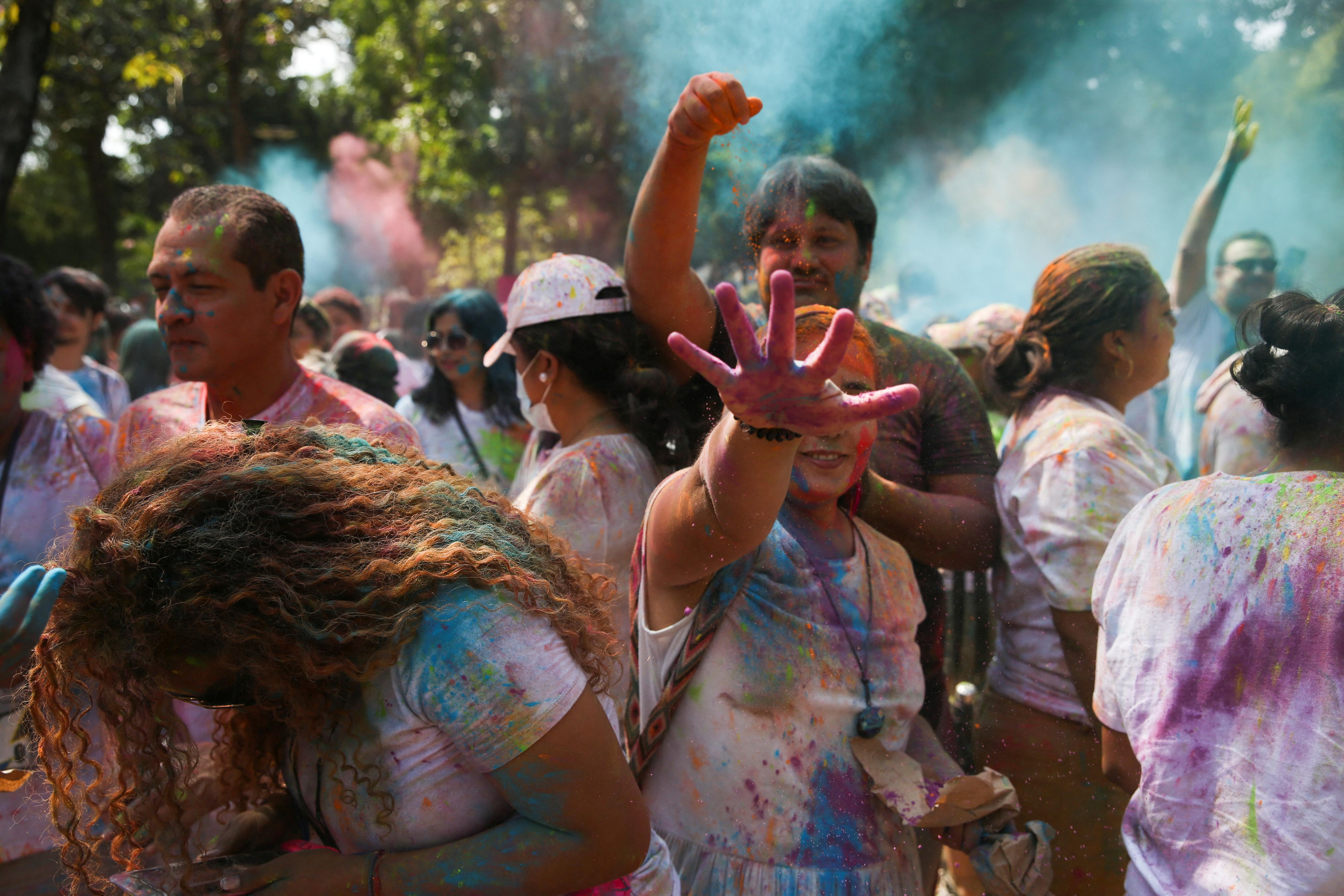 People take part in a symbolic Holi celebration organized by the Embassy of India, in San Salvador, El Salvador on March 4, 2023. (Photo by Jose Cabezas/Reuters)