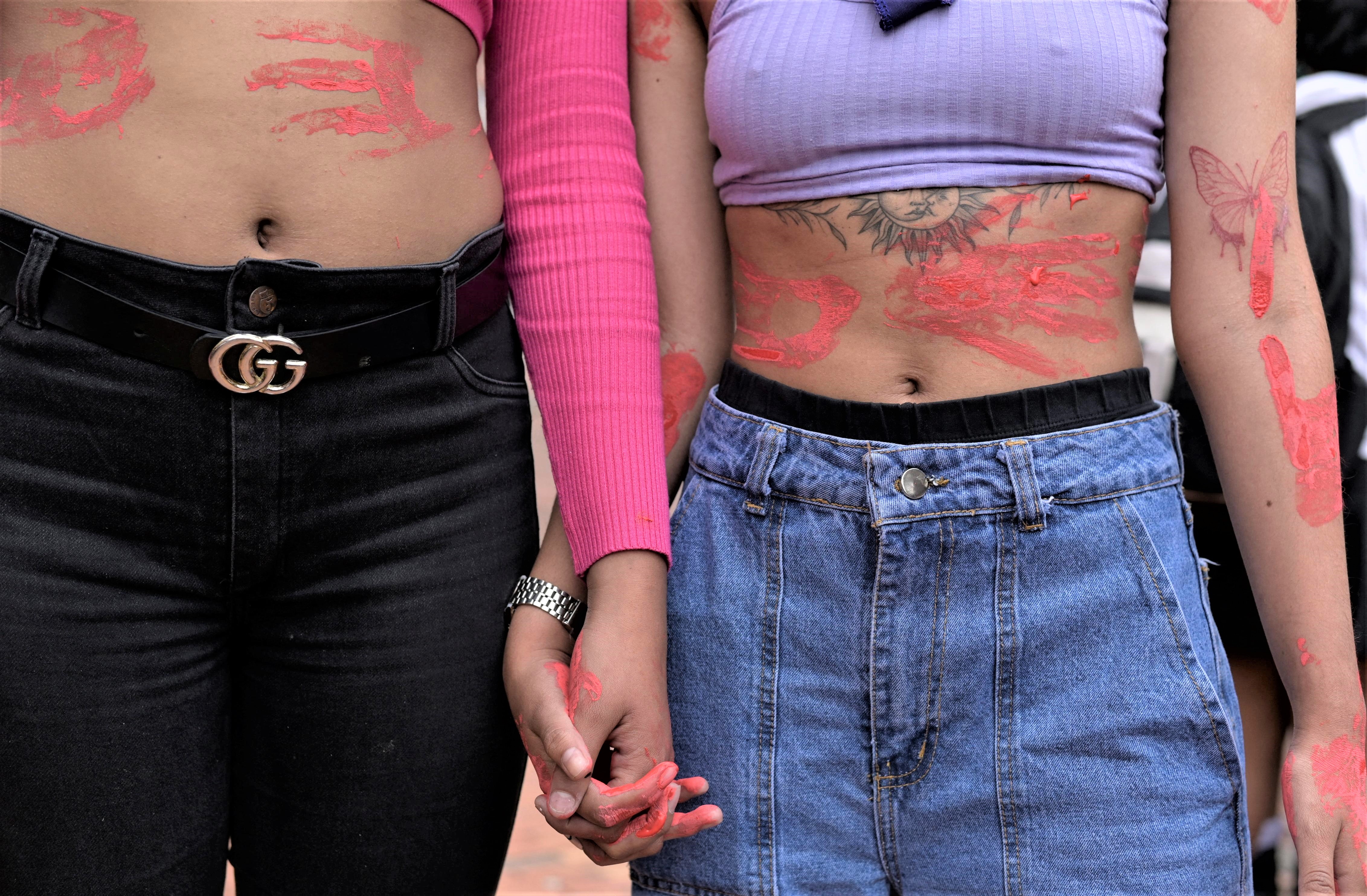 Women with red paint on their bodies participate in a rally to mark International Women's Day, in Bogota, Colombia on March 8, 2023. (Photo by Mahe Elipe/Reuters)