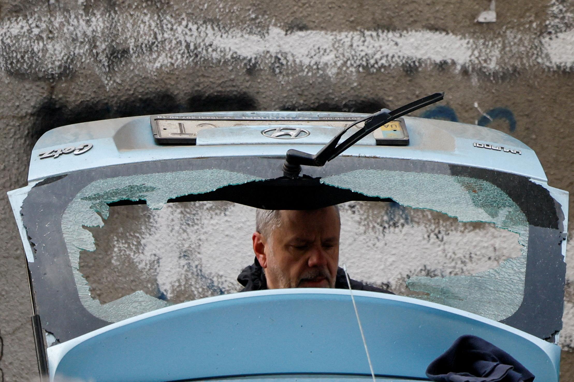 A man checks a damaged car at the site of a Russian missile strike, amid Russia's attack on Ukraine, in Kyiv, Ukraine on March 9, 2023. (Photo by Gleb Garanich/Reuters)