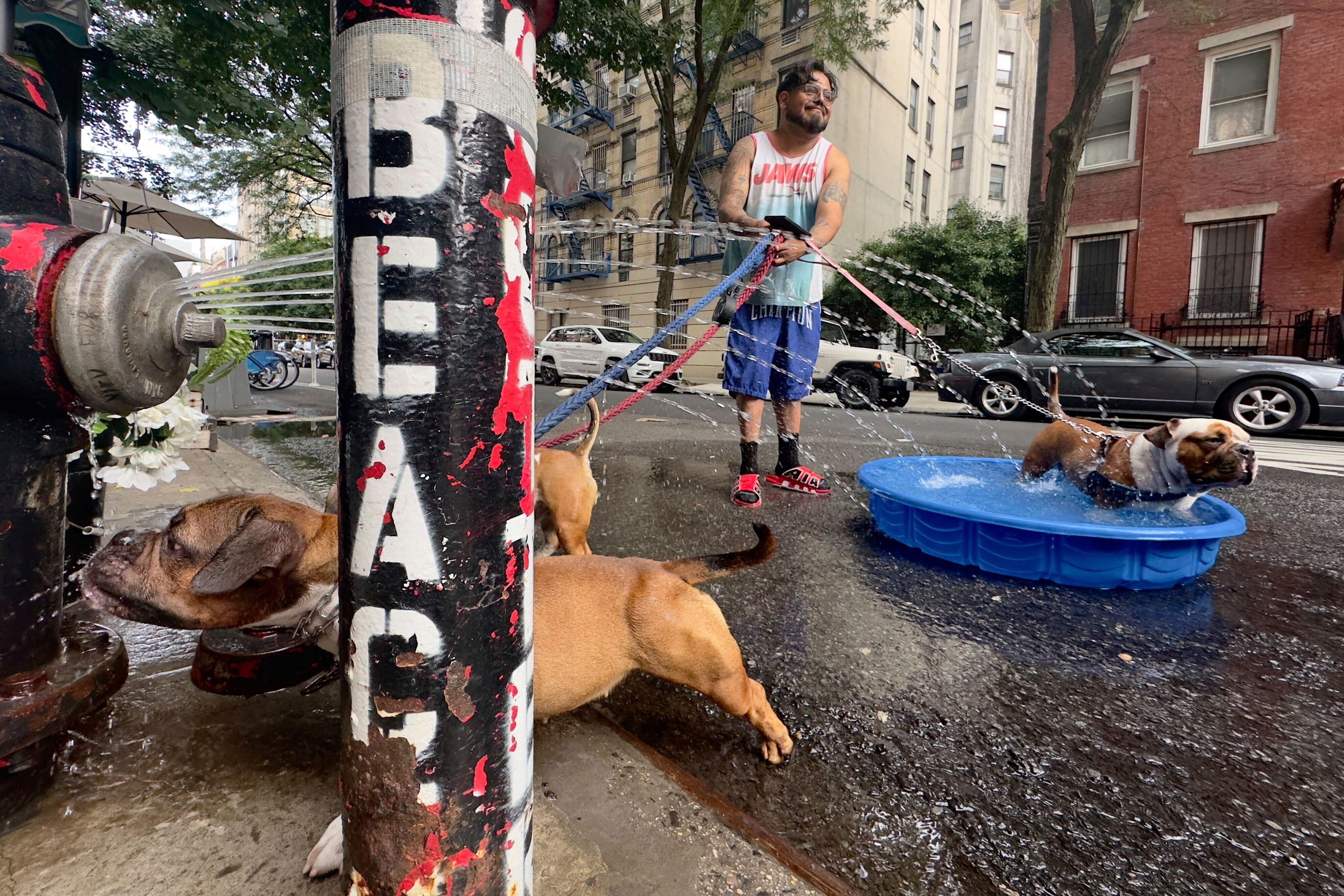 Edgar Sanchez stops on a walk with his dogs who cool off in a pool beside a fire hydrant sprayer, Saturday, June 22, 2024, in the Lower East Side neighborhood of New York. (Photo by John Minchillo/AP Photo)