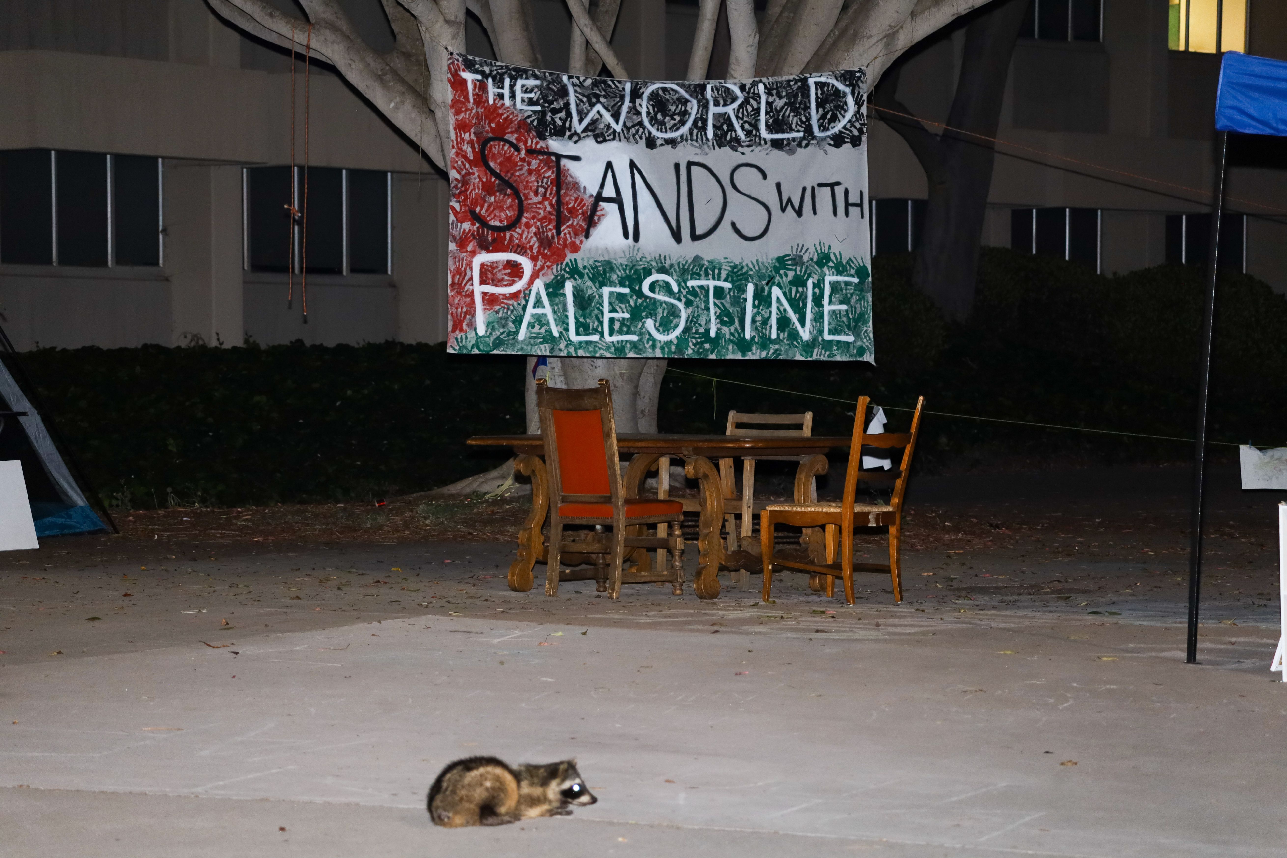 A sick or injured Raccoon is seen on the night of June 18th, 2024 lingering in the controversial Pro-Palestine Protest Encampment on the University of California, Santa Barbara (UCSB) Campus. Here he lays on the pavement in front of a sign that says, “The World Stands With Palestine”. (Photo by Amy Katz/ZUMA Press Wire/Rex Features/Shutterstock)