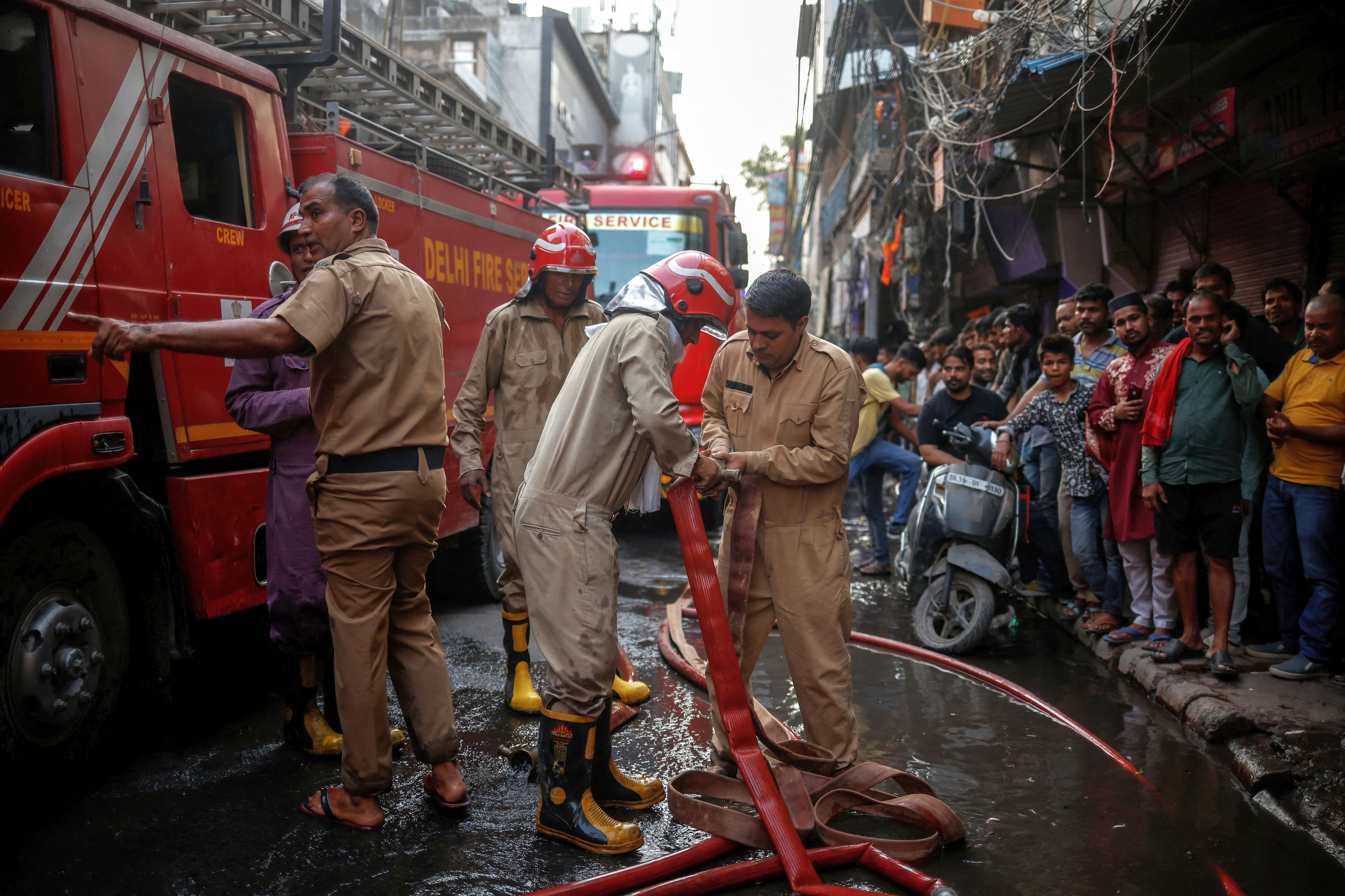Firefighters try to join hoses so they can reach a rooftop during an ongoing fire in some textile shops at a market area in the old quarters of Delhi, India, June 13, 2024. Fire officers say electrical failures are responsible for nearly three-quarters of the blazes this summer. With Delhi sweating through what the federal weather office says is one of its longest heat waves on record, demand for air cooling has surged. (Photo by Adnan Abidi/Reuters)