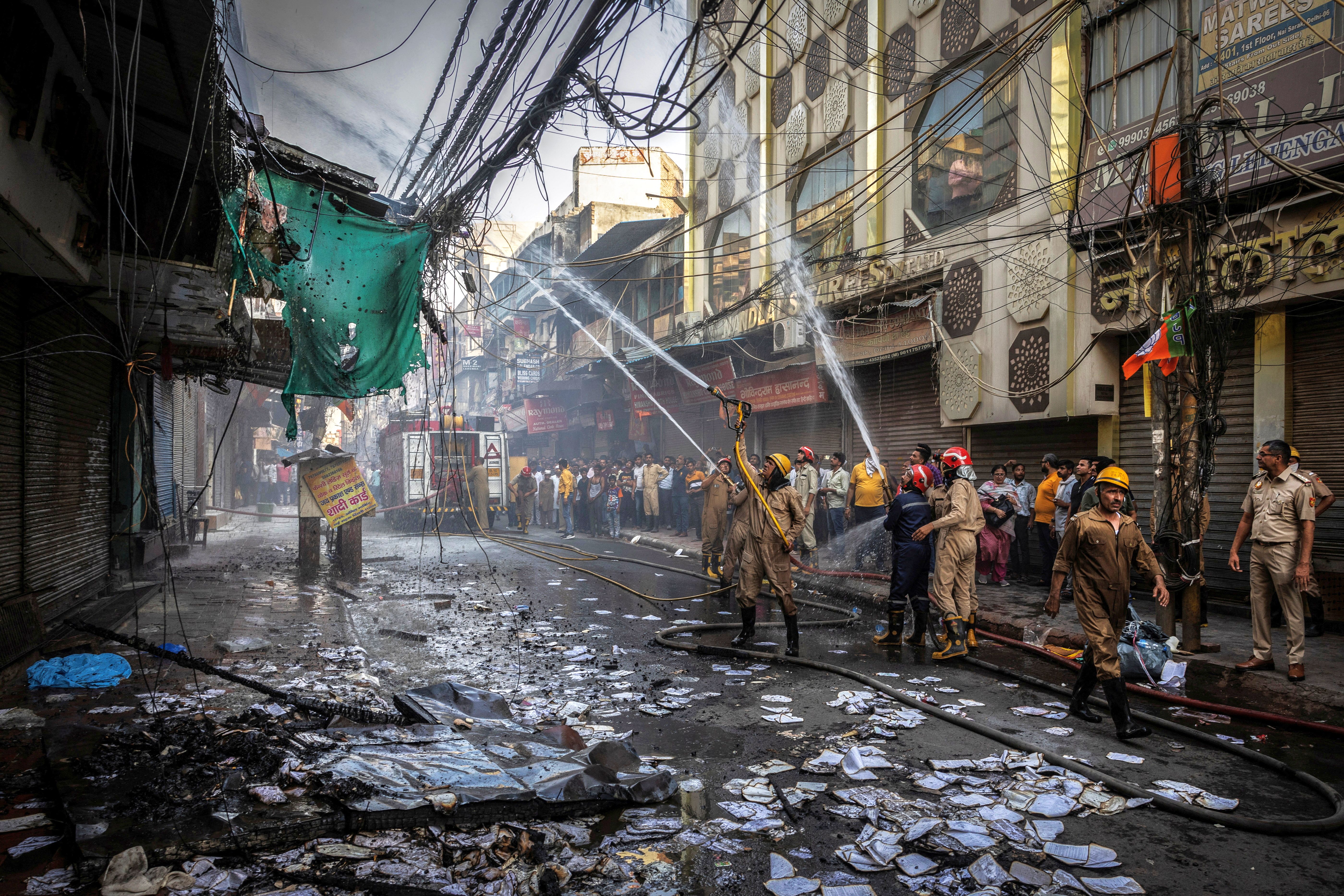 Firefighters try to extinguish a fire in some textile shops at a market area in the old quarters of Delhi, India, June 13, 2024. (Photo by Adnan Abidi/Reuters)