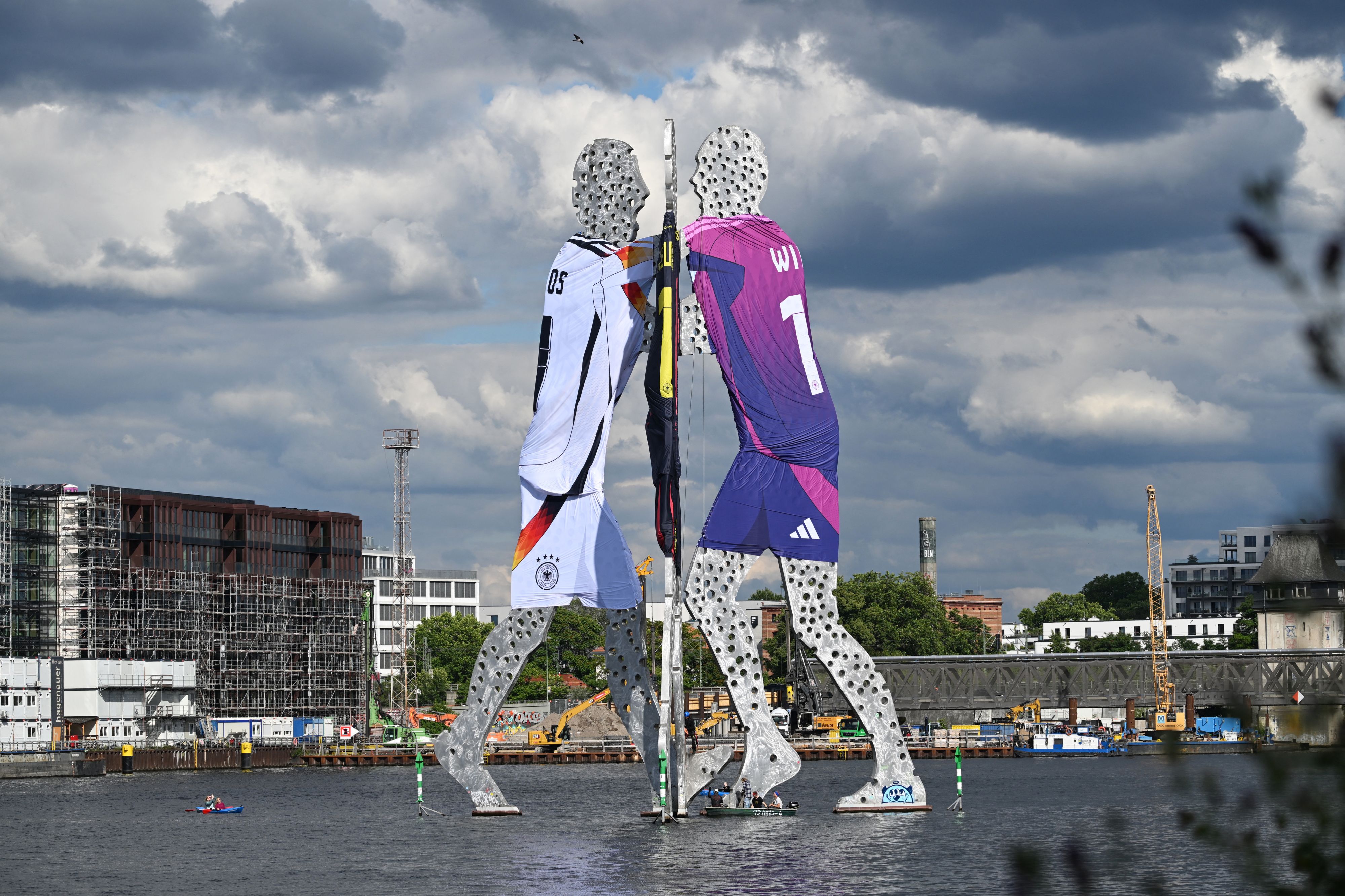 The “Molecule Man' sculpture designed by US artist Jonathan Borofsky is pictured wearing the three different Germany's national kits in the water of the river Spree in Berlin on June 13, 2024, ahead of the UEFA Euro 2024 European Football Championship. (Photo by Ralf Hirschberger/AFP Photo)