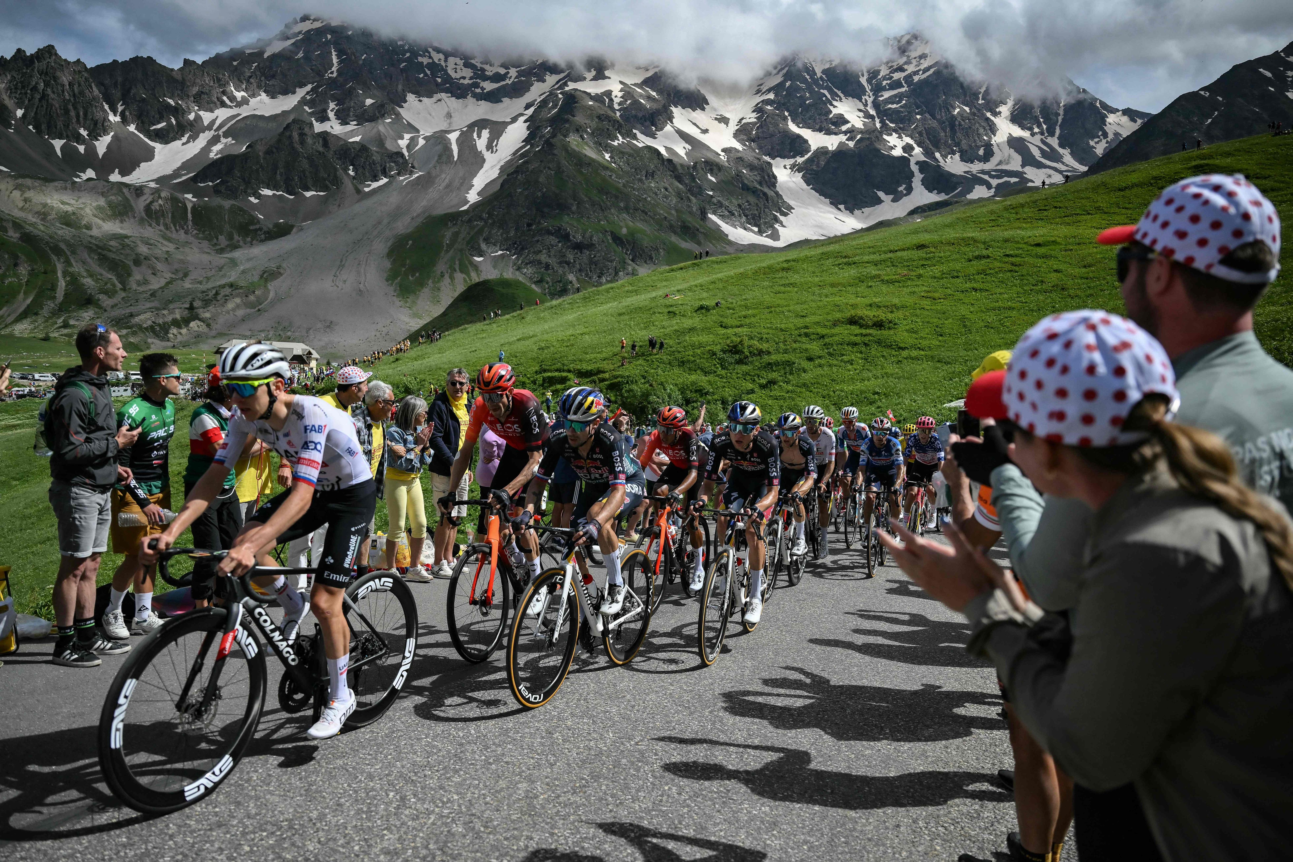 UAE Team Emirates team's Slovenian rider Tadej Pogacar (L) and Red Bull - BORA - hansgrohe team's Slovenian rider Primoz Roglic (2nd L) cycle with the pack of riders (peloton) in the Galibier ascent during the 4th stage of the 111th edition of the Tour de France cycling race, 140 km between Pinerolo in Italy, and Valloire in France, on July 2, 2024. (Photo by Marco Bertorello/AFP Photo)