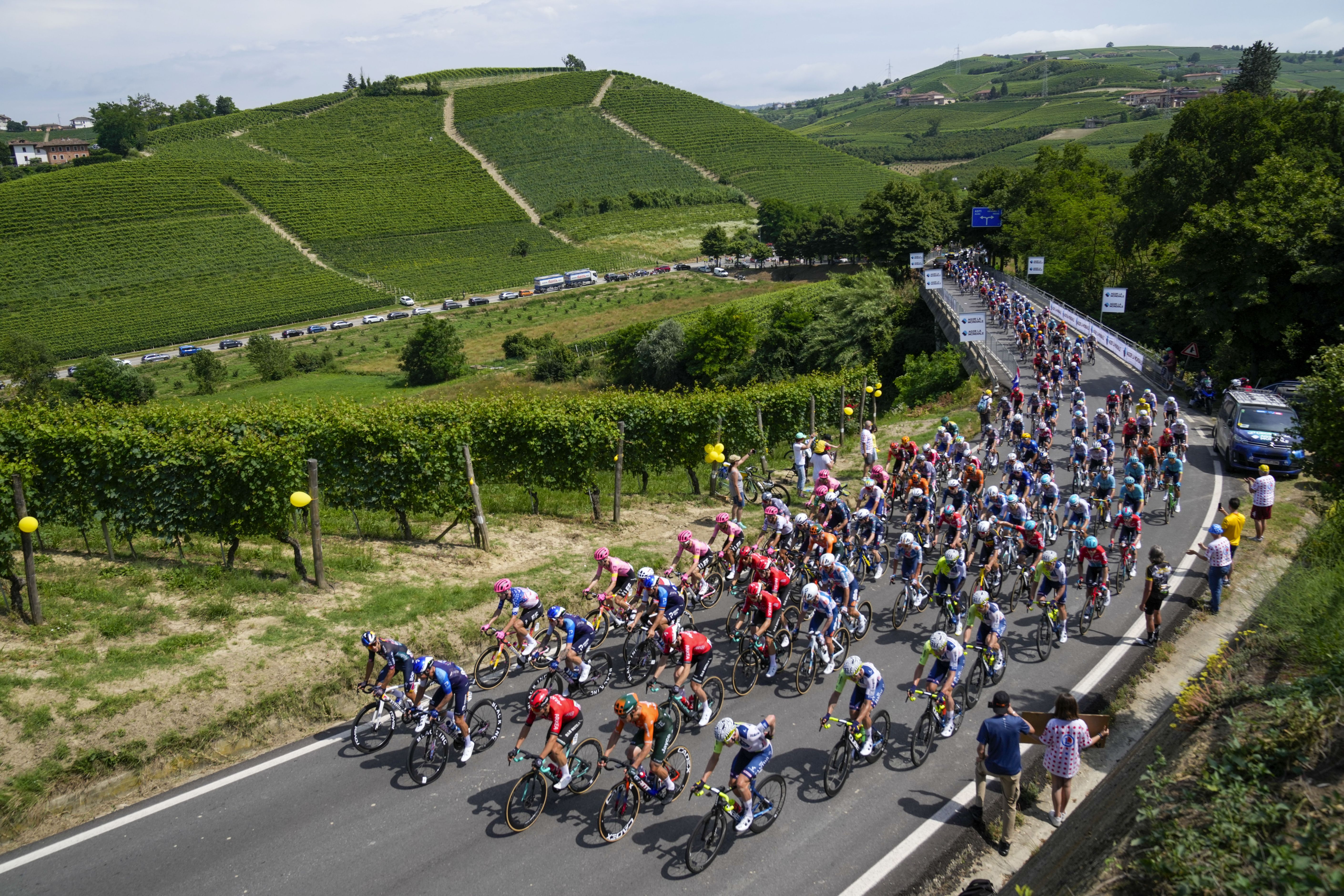 The pack climbs the hills and vineyards around Cuneo during the third stage of the Tour de France cycling race over 230.8 kilometers (143.4 miles) with start in Piacenza and finish in Turin, Italy, Monday, July 1, 2024. (Photo by Jerome Delay/AP Photo)