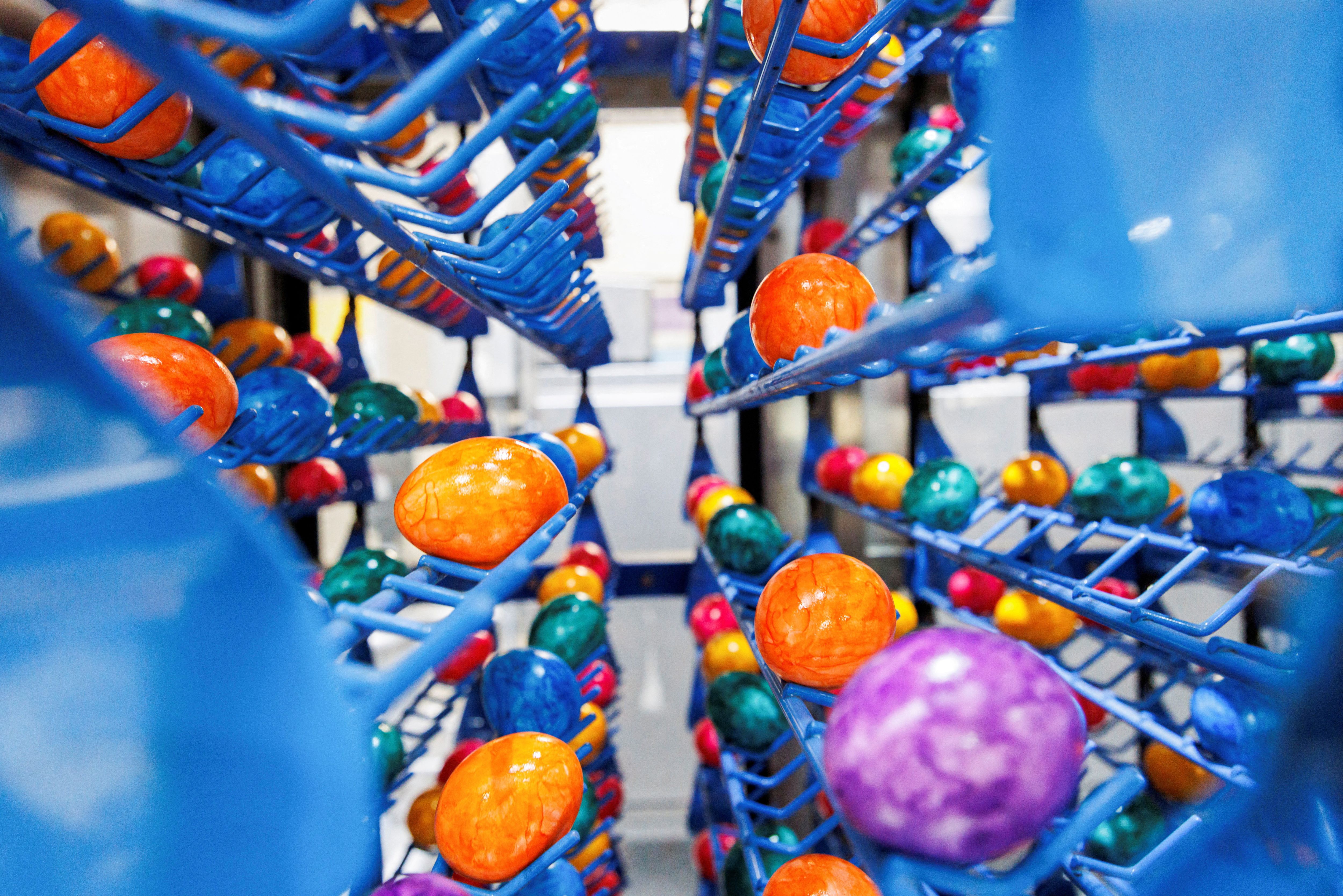 Freshly dyed eggs lie on a conveyor belt at the Beham coloured eggs company in Ursberg near Augsburg, Germany on March 31, 2023. (Photo by Lukas Barth/Reuters)
