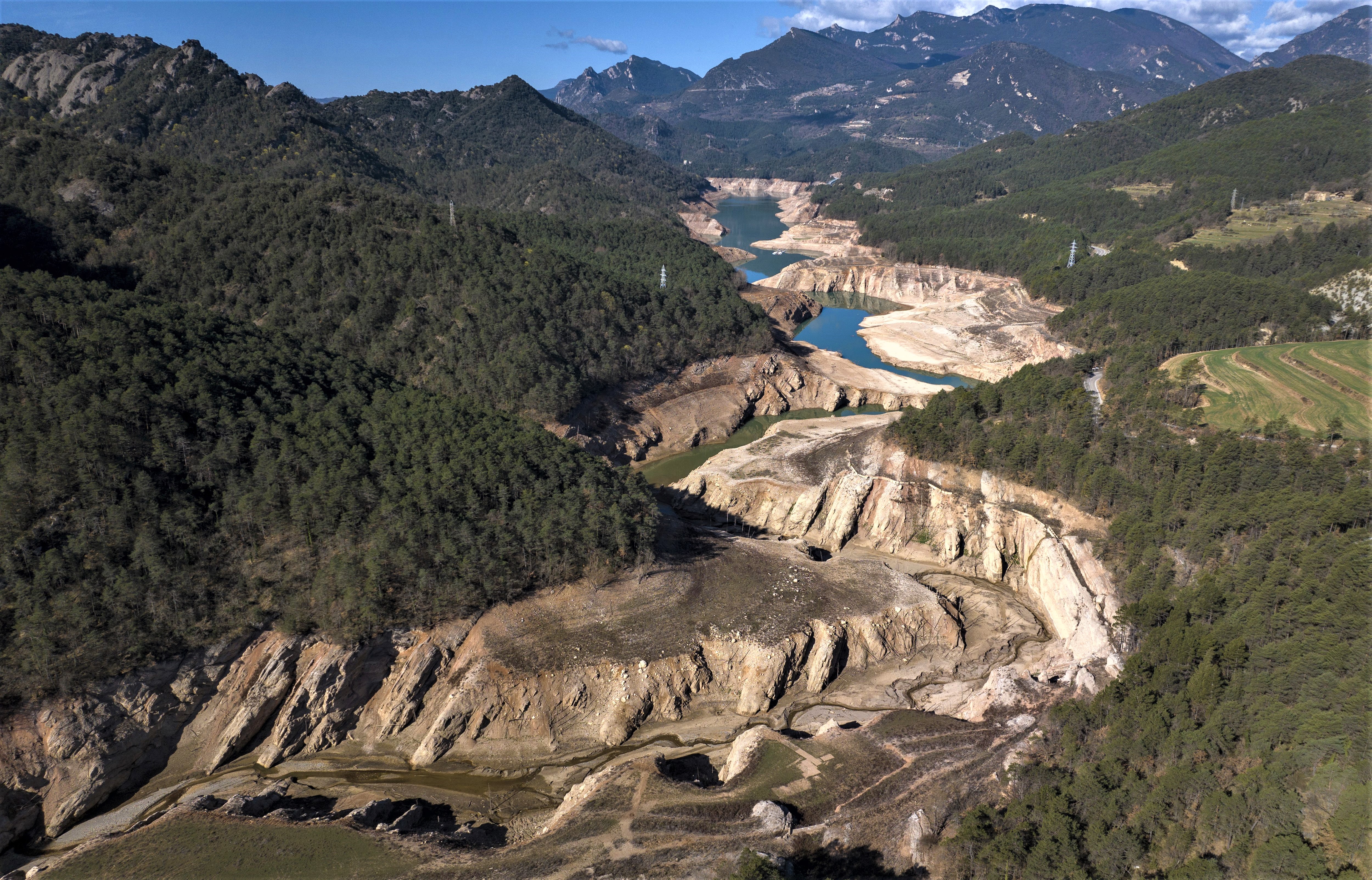 View of La Baells reservoir in Berga, about 112 km (69 miles) north of Barcelona. Spain, Sunday, March 26, 2023. Farmers and parishioners gathered Sunday at the small hermitage of l'Espunyola, a rural village in Catalonia, to attend a mass asking the local virgin Our Lady of the Torrents for rain. All three reservoirs near the village are below a third of their capacity, with la Baells reservoir only a 25% full. They are no exception to reservoirs in the Barcelona region, after a strike of 30 months of very little rain. (Photo by Emilio Morenatti/AP Photo)