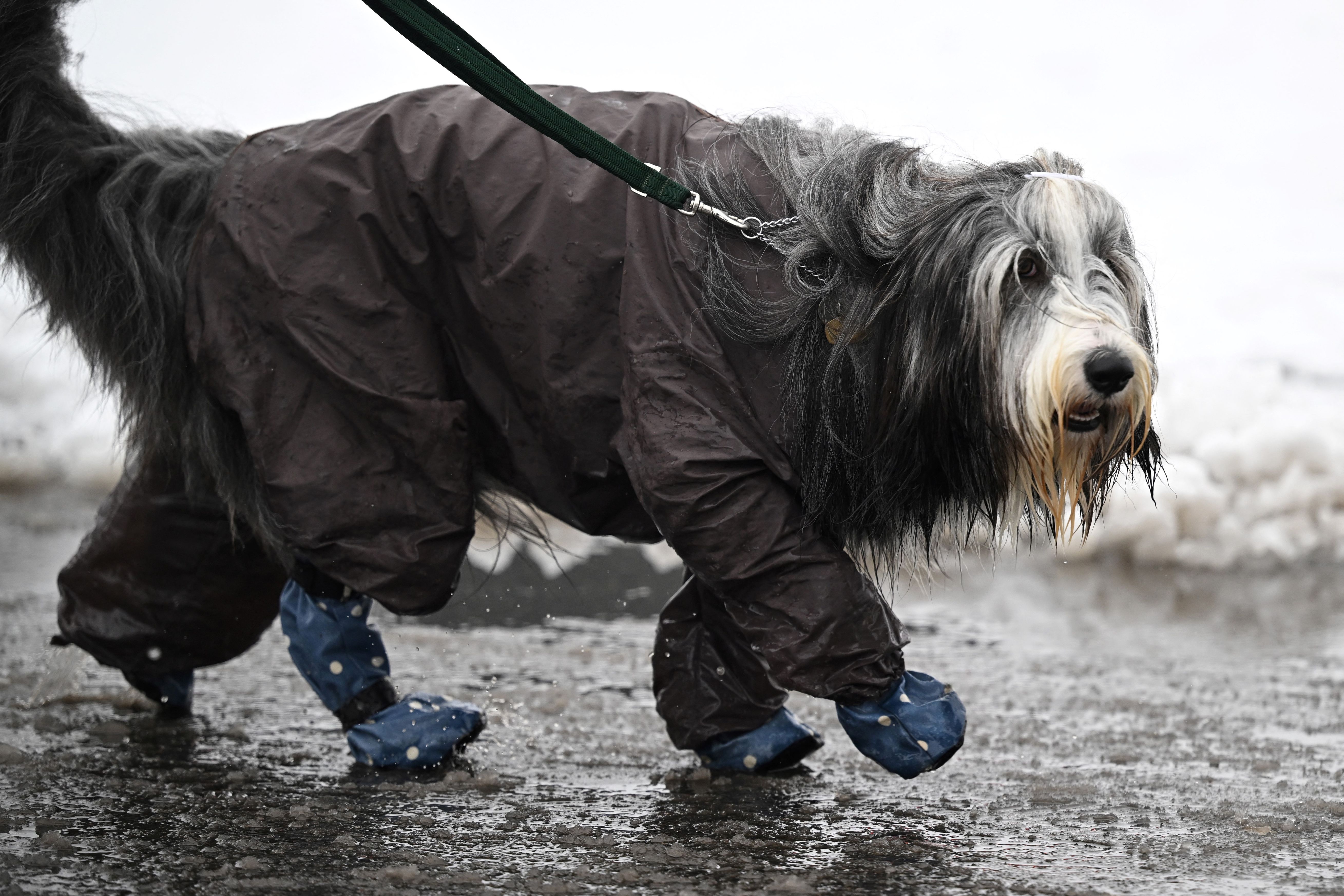 A dog wearing a coat to protect it from the inclement weather arrives for the second day of the Crufts dog show at the National Exhibition Centre in Birmingham, central England, on March 10, 2023. (Photo by Oli Scarff/AFP Photo)