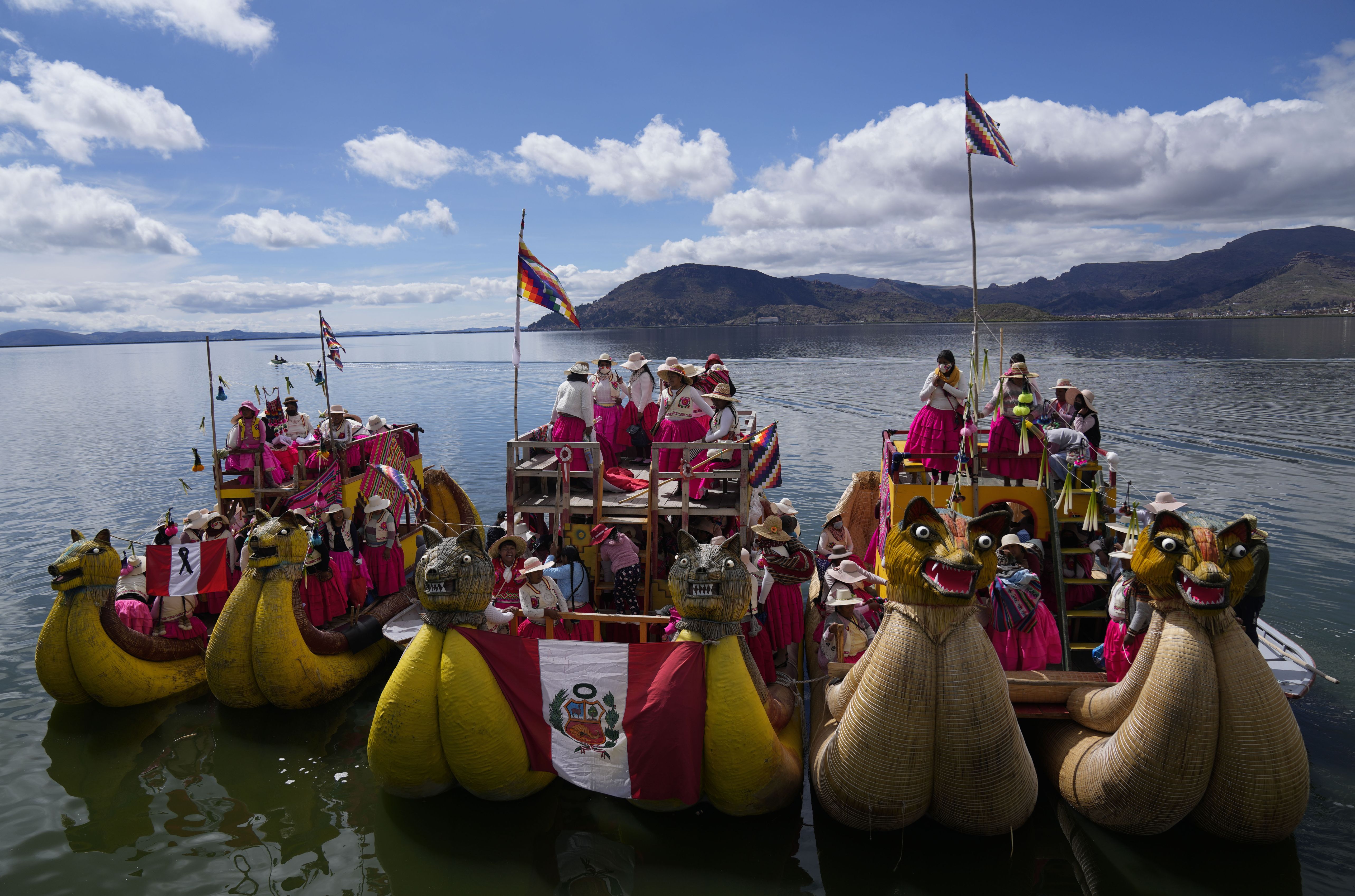 Aymara Indigenous women arrive in boats on Lake Titicaca from the Uros floating islands to attend a march marking International Women's Day in to Puno, Peru, Wednesday, March 8, 2023. (Photo by Juan Karita/AP Photo)