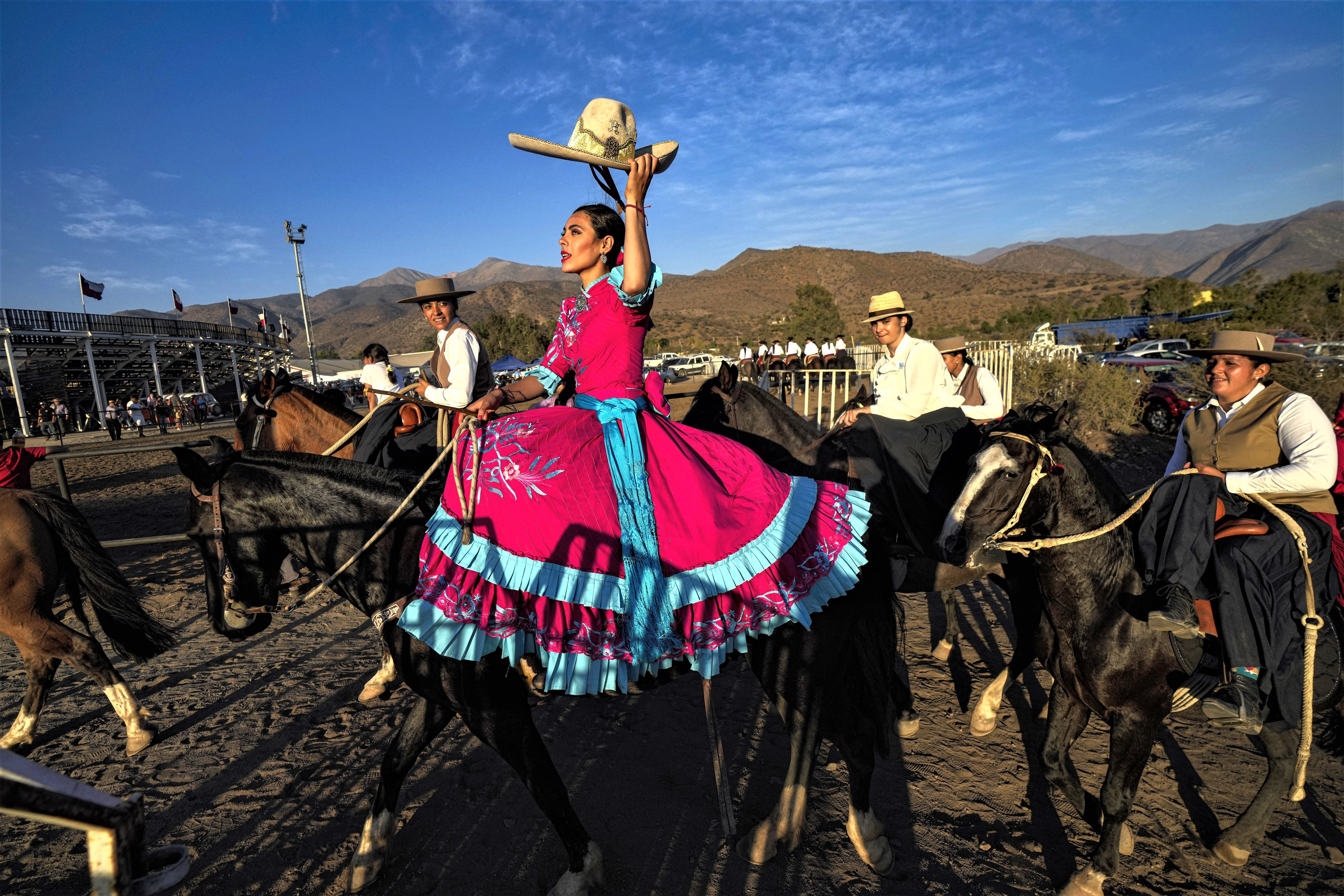 A Mexican female rider raises her hat during the first Colina Equestrian Squad Meeting, in Colina, Santiago, Saturday, March. 18, 2023. Countries represented include Chile, Argentina, Spain, Mexico, Peru and Panama. (Photo by Esteban Felix/AP Photo)