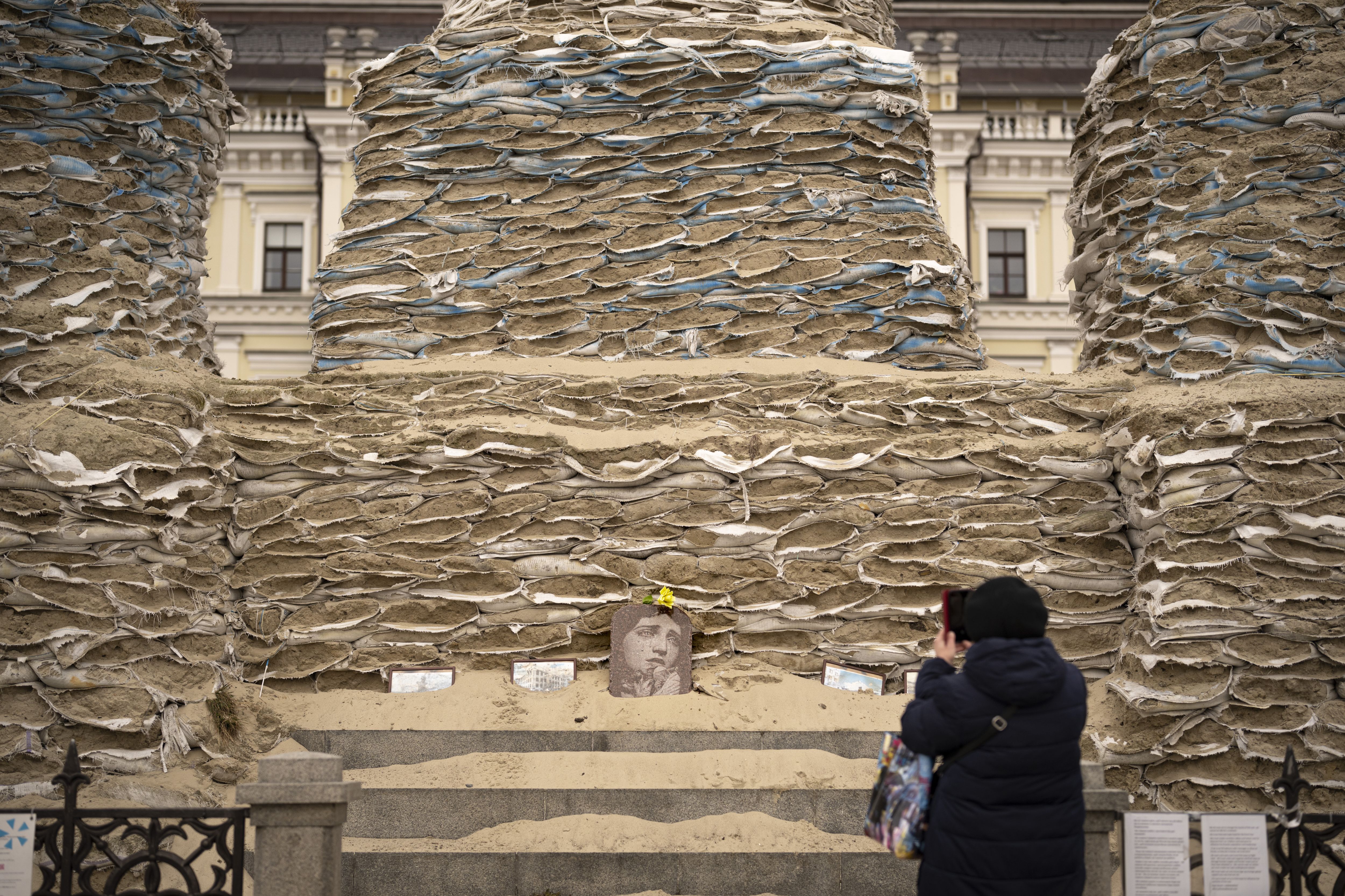 A woman takes pictures of the statue of Grand Princess Olga of Kyiv, covered in sandbags to avoid damage from potential shelling, in Kyiv, Ukraine, Friday, March 3, 2023. (Photo by Vadim Ghirda/AP Photo)