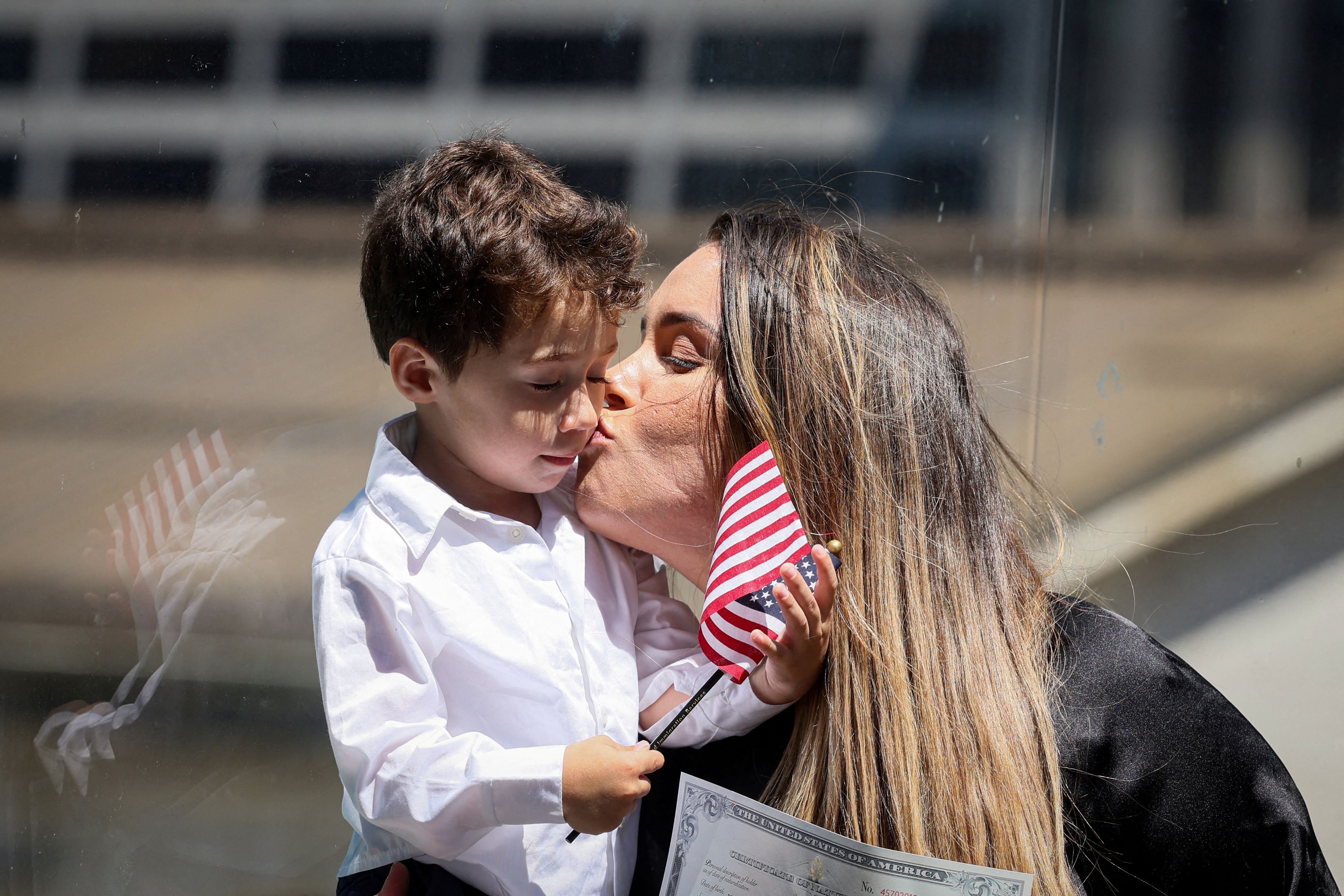 A woman kisses her child following her U.S. Citizenship and Immigration Services (USCIS) naturalization ceremony at the New York Public Library, in New York City on July 2, 2024. (Photo by Brendan McDermid/Reuters)