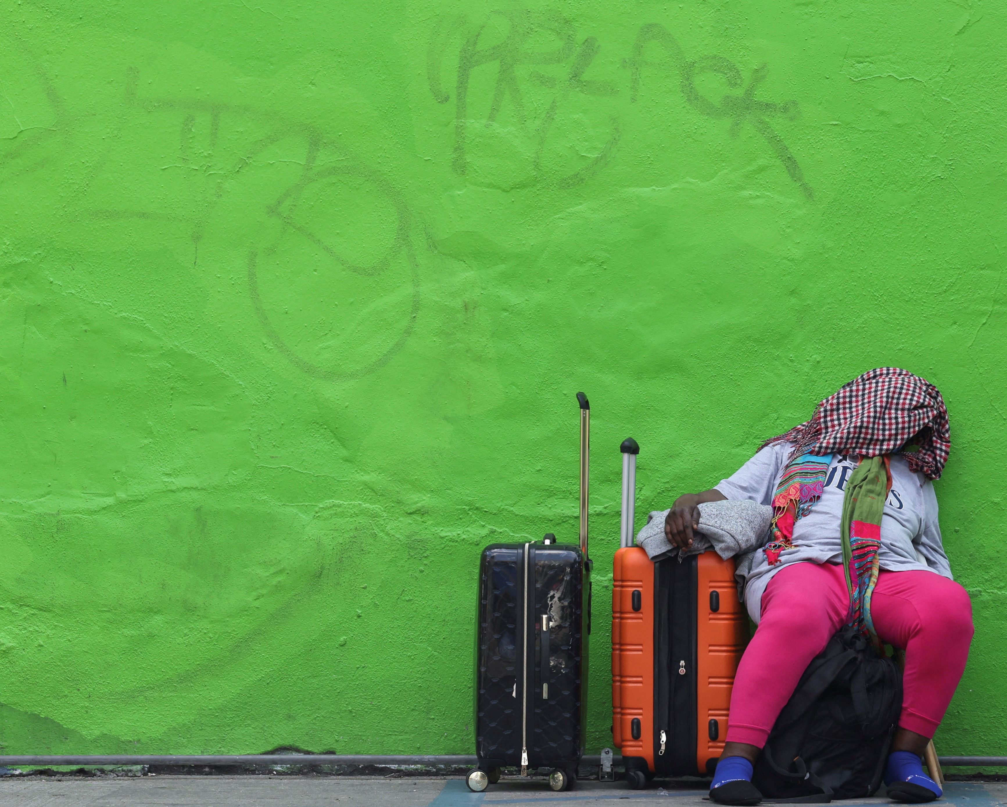 A woman waits at a FlixBus bus stop in New York City on July 2, 2024. (Photo by Kent J Edwards/Reuters)