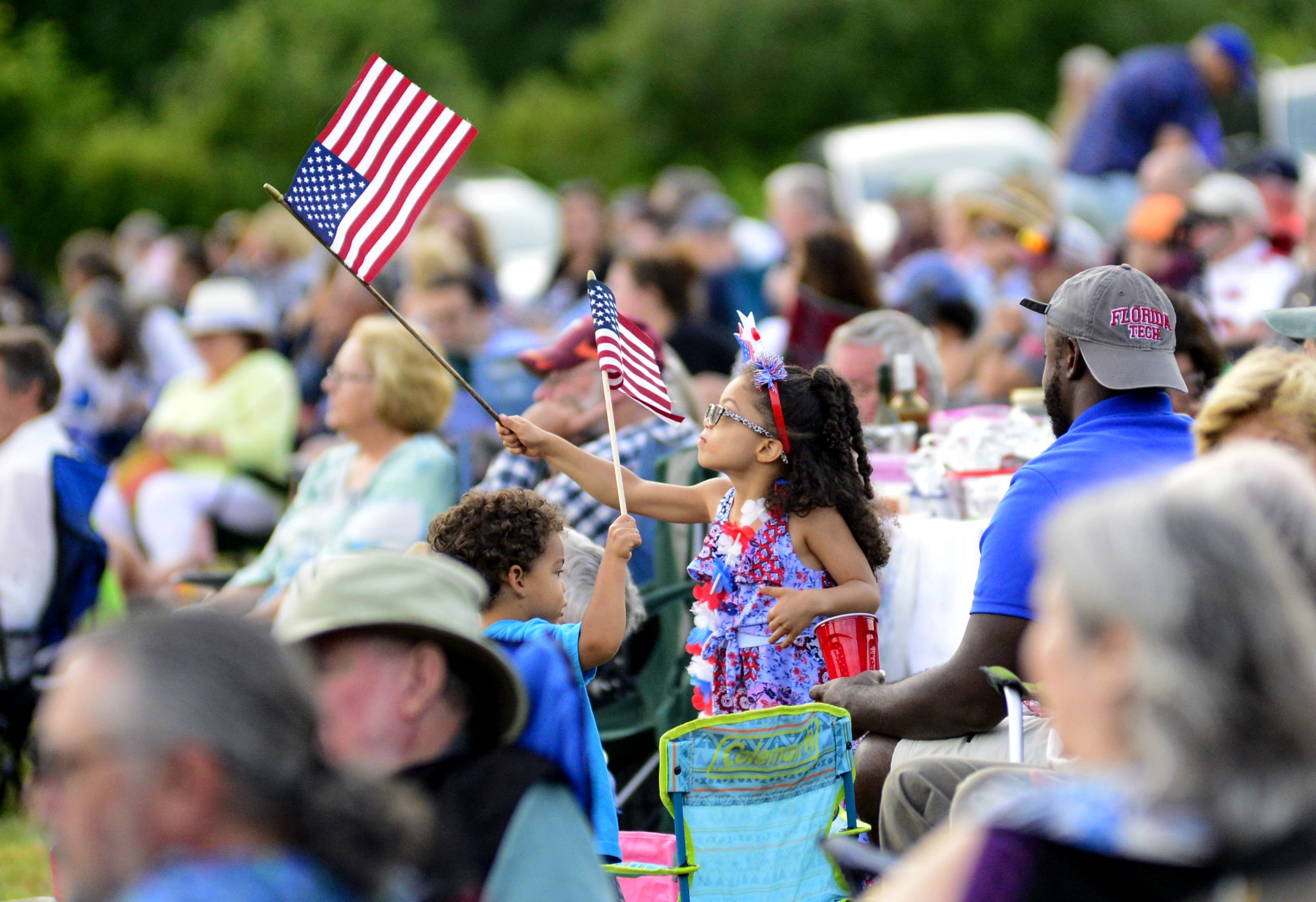 Gabriella Willams, 5, waves an American Flag during the "Symphony of Stars" as part of the 2024 Vermont Symphony Orchestra Summer Festival Tour in Grafton, Vt., Wednesday, July 3, 2024. (Photo by Kristopher Radder/The Brattleboro Reformer via AP Photo)