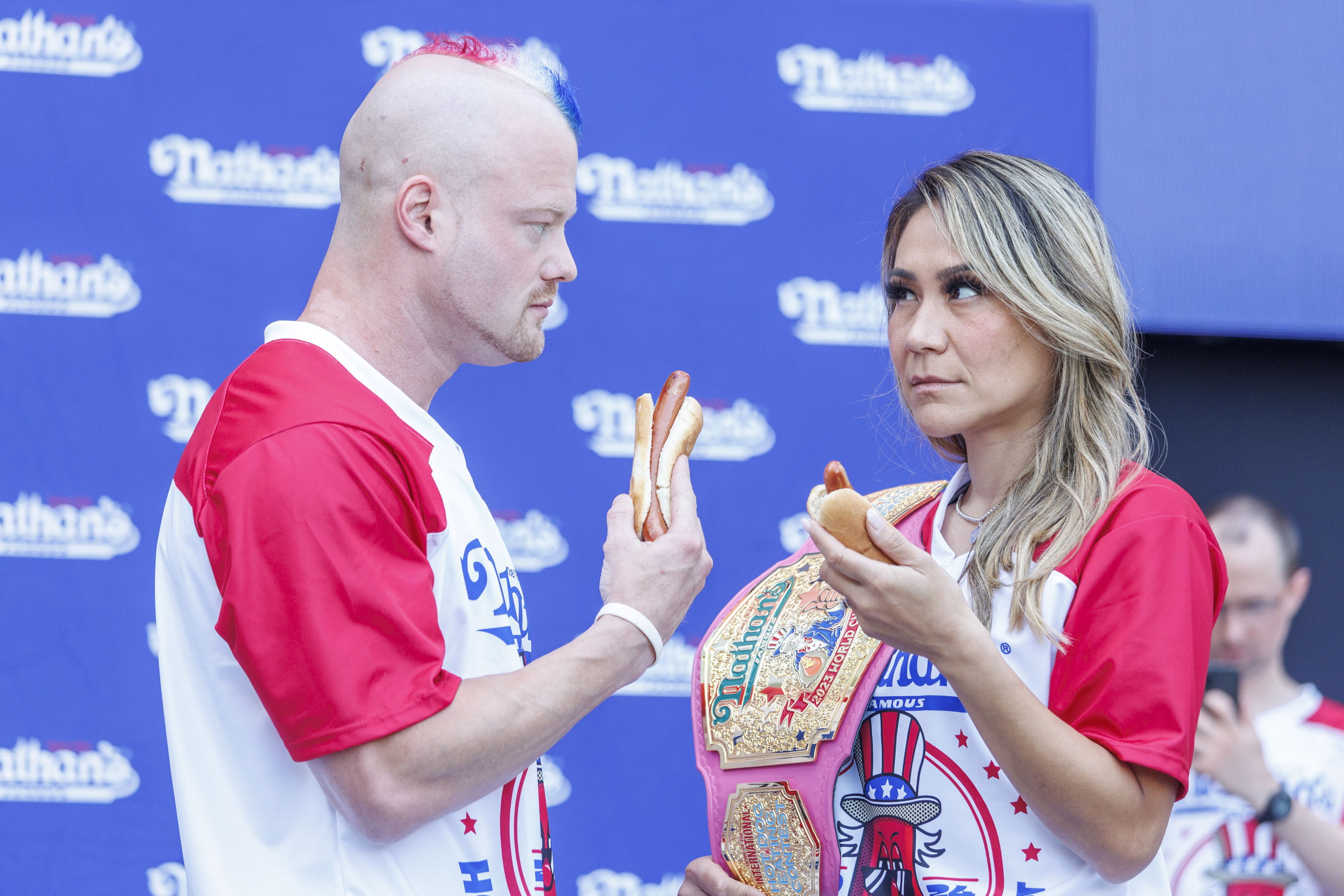 Top ranked competitive eaters, Nick Wehry (L) and Miki Sudo (R), do a “stare down”' during a weigh-in ceremony for Nathan's Famous Fourth of July International Hot Dog Eating Contest in New York, New York, 03 July 2024. Nathan's Annual Fourth of July International Hot Dog Eating Contest will take place 04 July in Coney Island, when contestants will attempt to eat as many hot dogs and buns as they can in 10 minutes. (Photo by Sarah Yenesel/EPA)