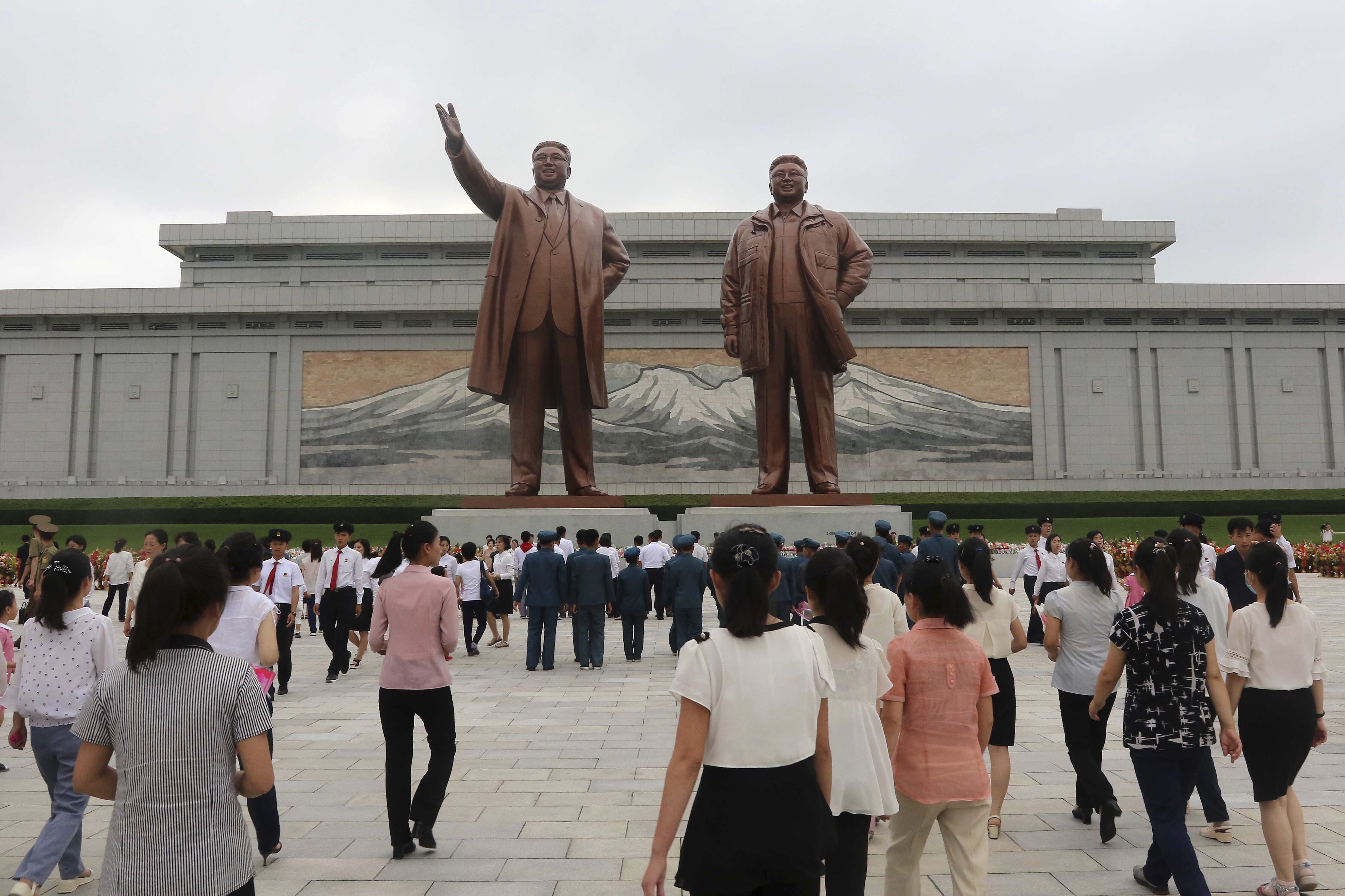 People visit Mansu Hill to pay respect to the statues of former leaders, Kim Il Sung, left, and Kim Jong Il on the occasion of the 30th anniversary of demise of Kim Il Sung, in Pyongyang, North Korea, Sunday, July 7, 2024. (Photo by Jon Chol Jin/AP Photo)