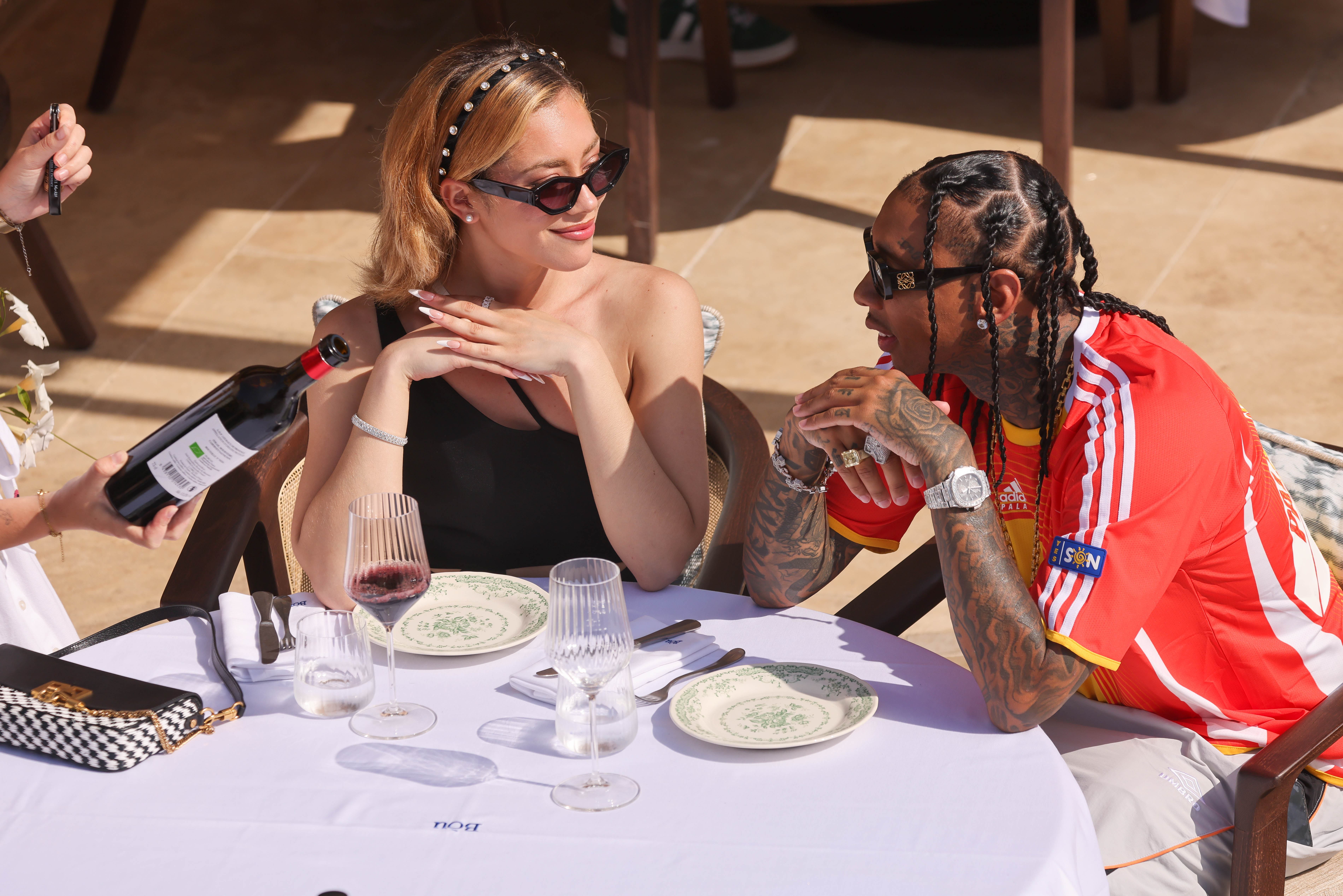 Tyga shoots a music video and then has lunch with a female companion on the Port of Saint-Tropez, France on June 27, 2024. The American rapper wore a red football jersey paired with Umbro track pants. (Photo by The Image Direct)
