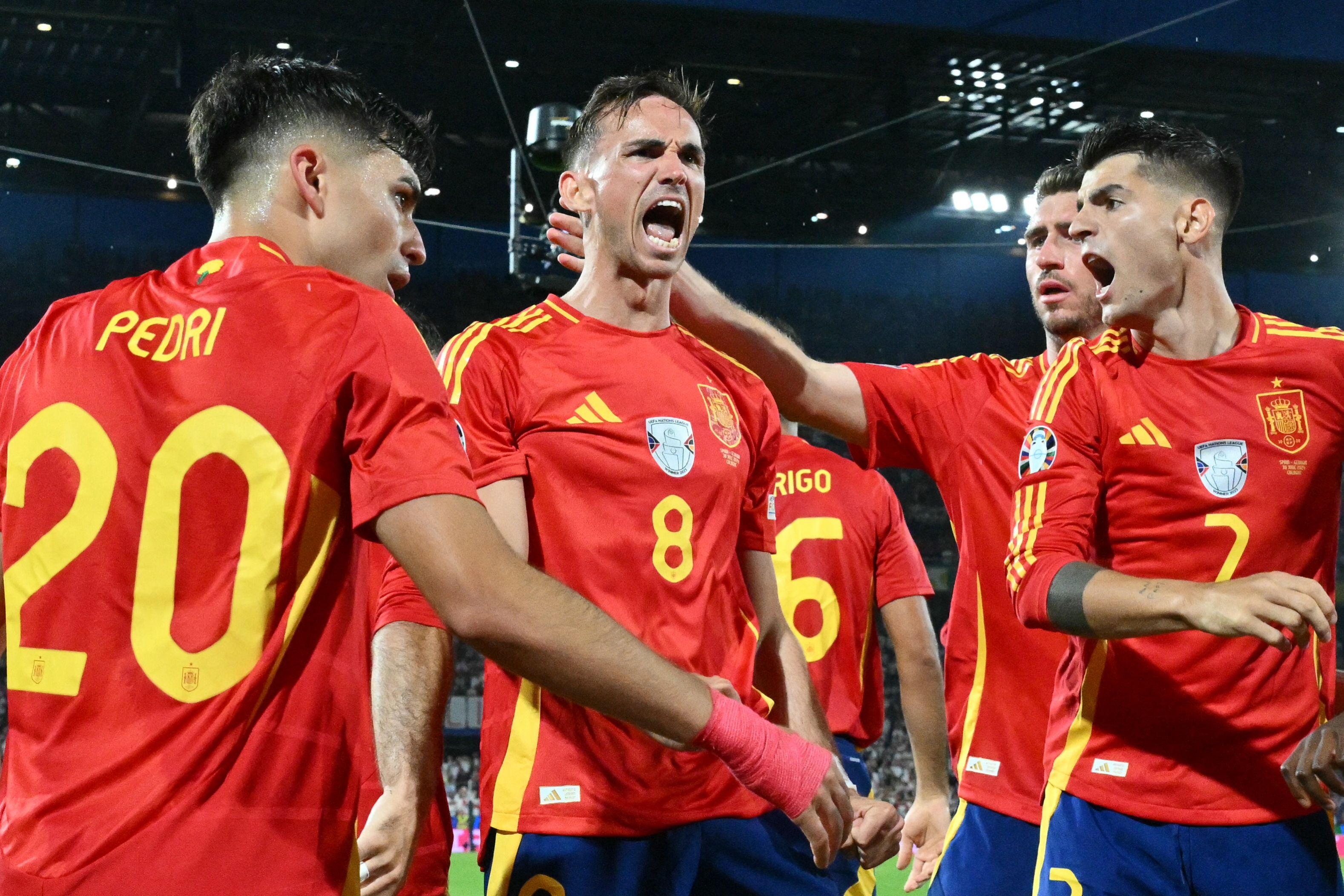 Spain's midfielder #08 Fabian Ruiz celebrates with teammates after scoring his team's second goal during the UEFA Euro 2024 round of 16 football match between Spain and Georgia at the Cologne Stadium in Cologne on June 30, 2024. (Photo by Alberto Pizzoli/AFP Photo)
