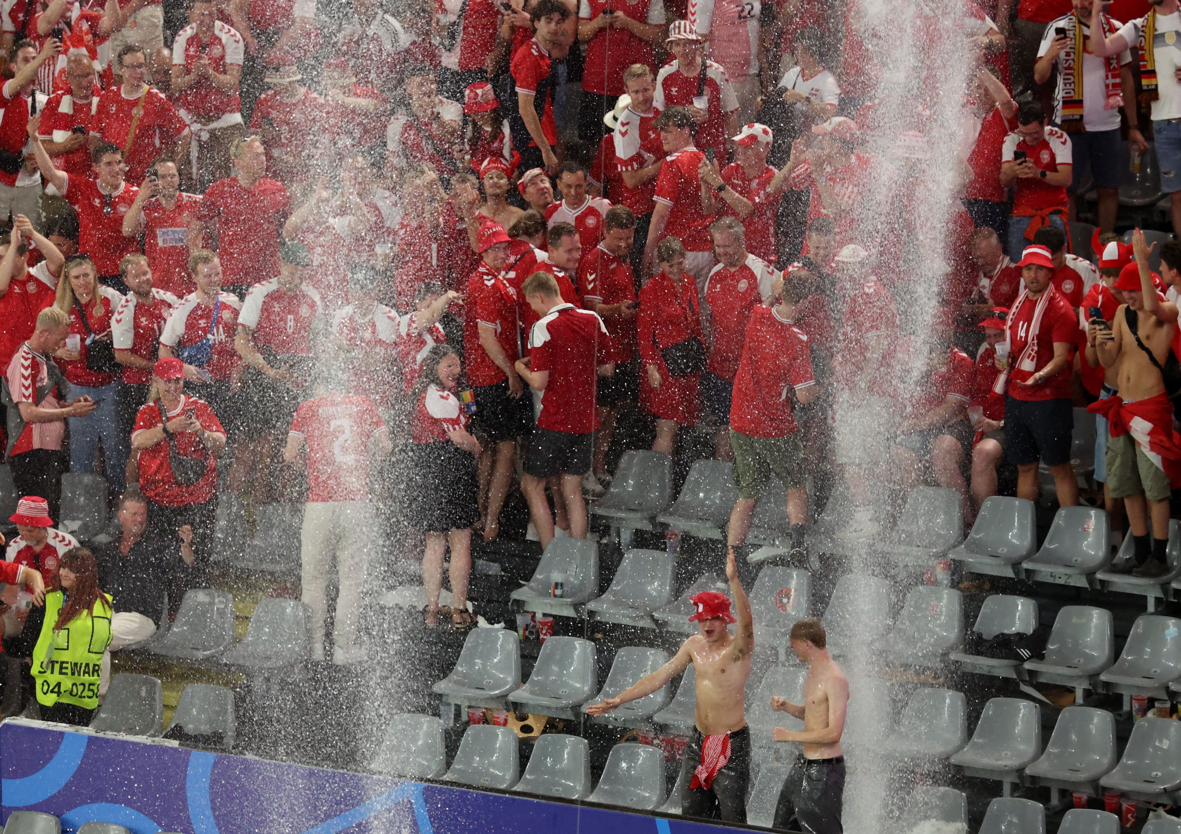 Supporters brave the elements as match is interrupted due to thunder and lightning during the UEFA EURO 2024 Round of 16 soccer match between Germany and Denmark, in Dortmund, Germany, 29 June 2024. (Photo by Georgi Licovski/EPA)
