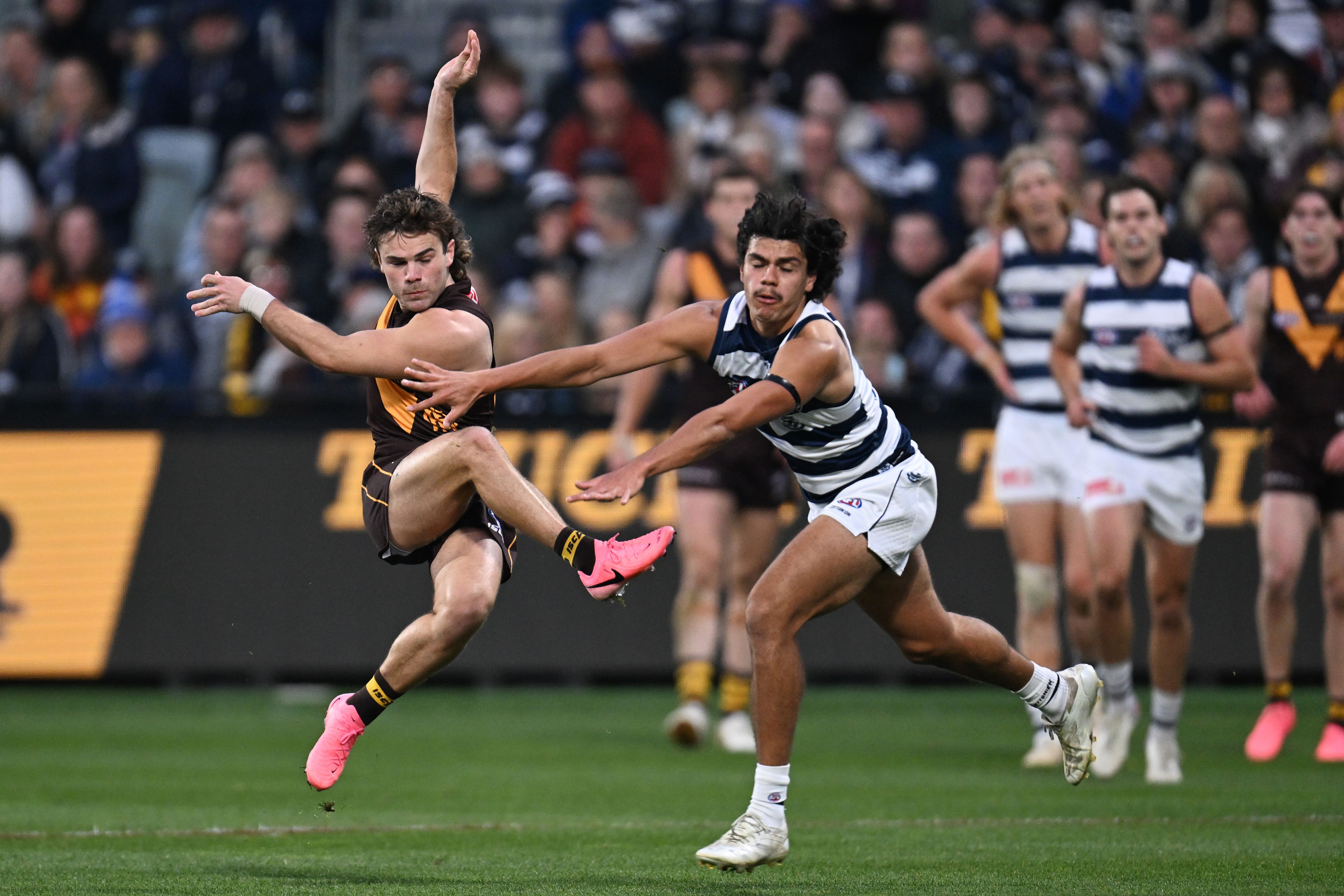 Nick Watson of the Hawks kicks the ball under pressure from Lawson Humphries of the Cats during the round 17 AFL match between Geelong Cats and Hawthorn Hawks at GMHBA Stadium, on July 06, 2024, in Geelong, Australia. (Photo by Daniel Pockett/Getty Images)