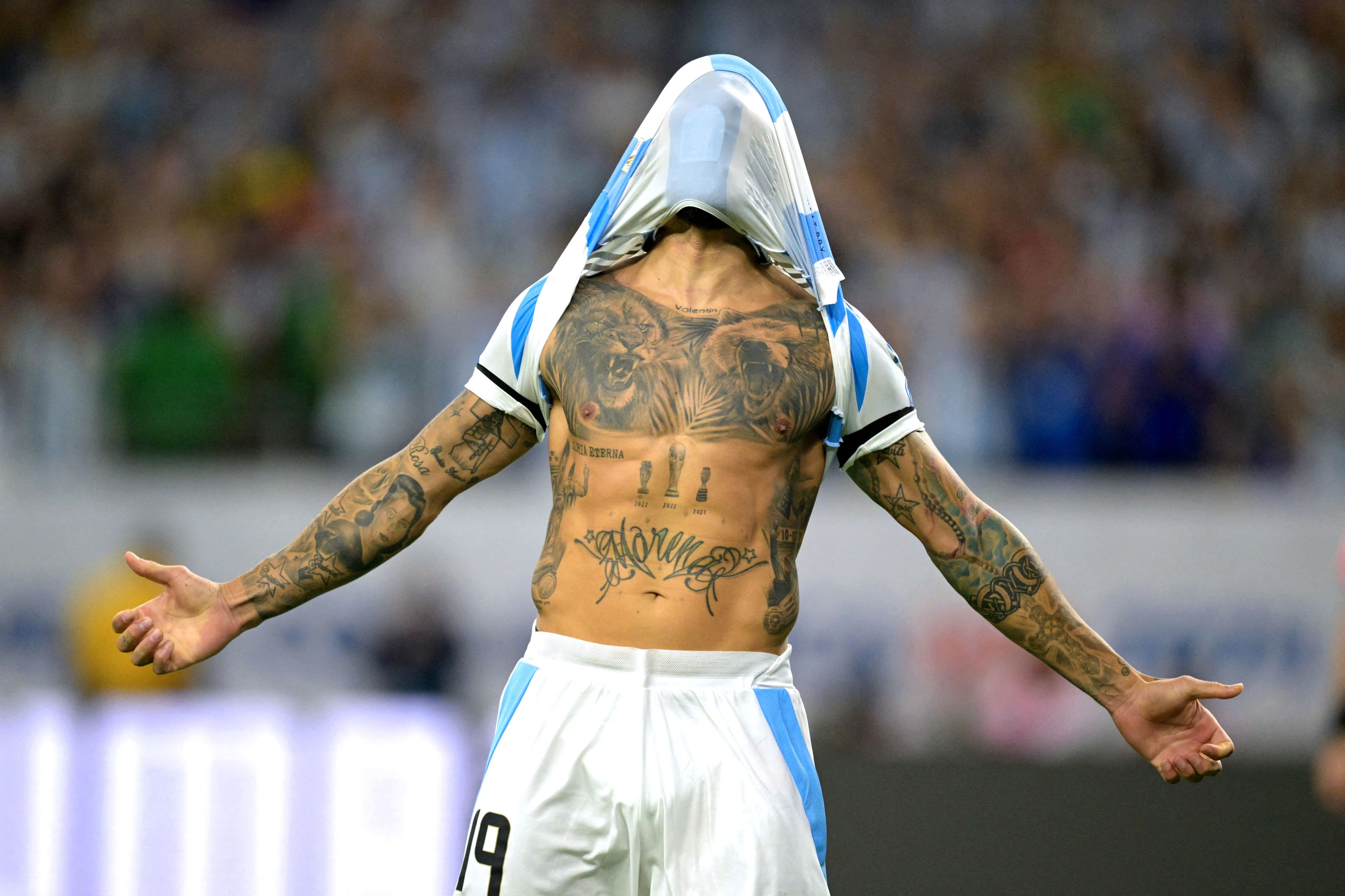 Argentina's defender #19 Nicolas Otamendi celebrates after scoring a goal during a penalty shoot out and winning the Conmebol 2024 Copa America tournament quarter-final football match between Argentina and Ecuador at NRG Stadium in Houston, Texas, on July 4, 2024. (Photo by Juan Mabromata/AFP Photo)