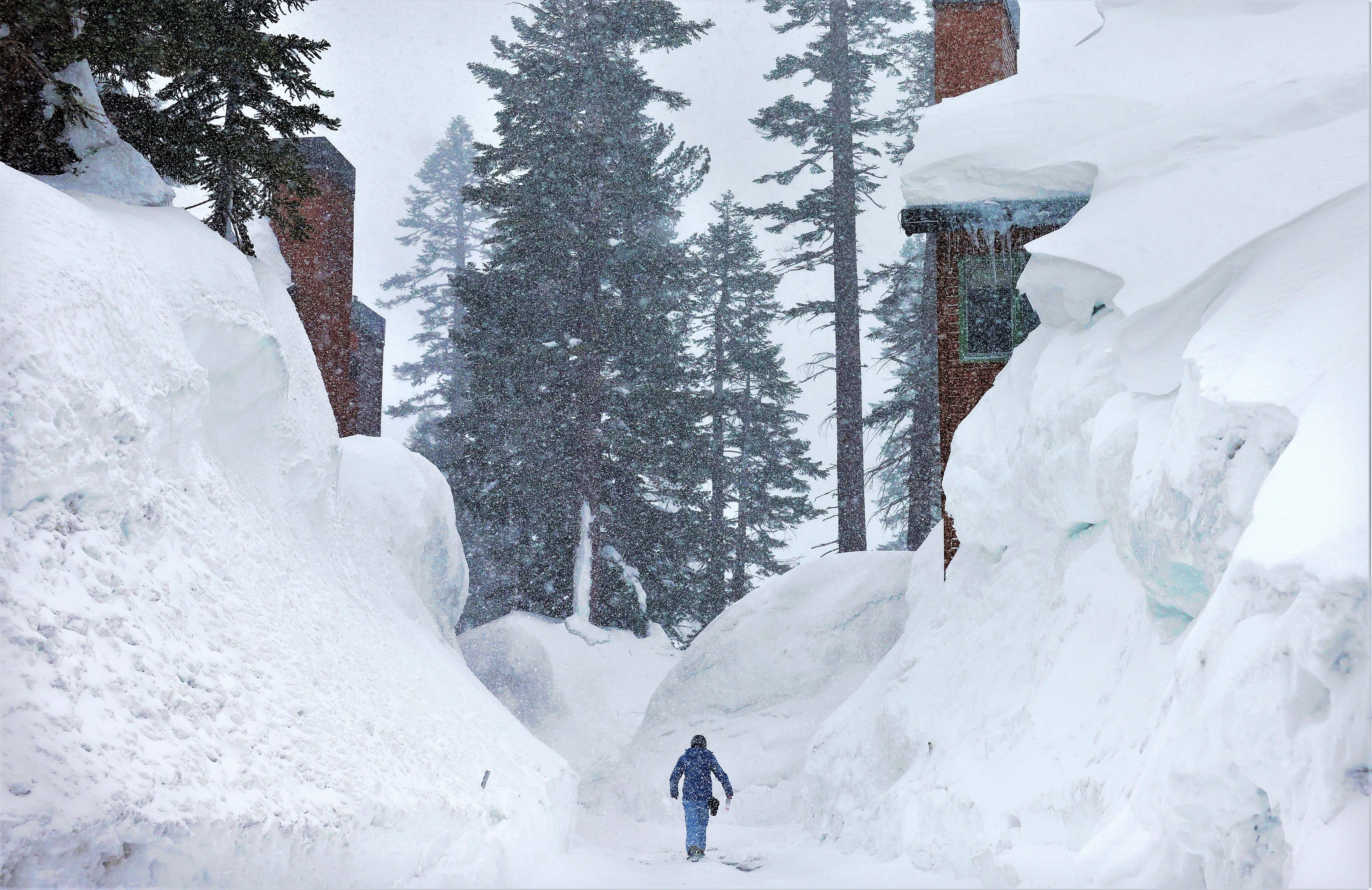 A person walks near snowbanks obscuring condominiums as snow falls in the Sierra Nevada mountains from yet another storm system which is predicted to bring heavy snow to higher elevations on March 28, 2023 in Mammoth Lakes, California. The Pacific storm is delivering widespread rain and mountain snow to the U.S. west coast in Northern California and Oregon. After years of drought, the state snowpack average for California may hit an all-time record from the several feet of new snow expected to fall during the storm in parts of the Sierra Nevada mountains. (Photo by Mario Tama/Getty Images)