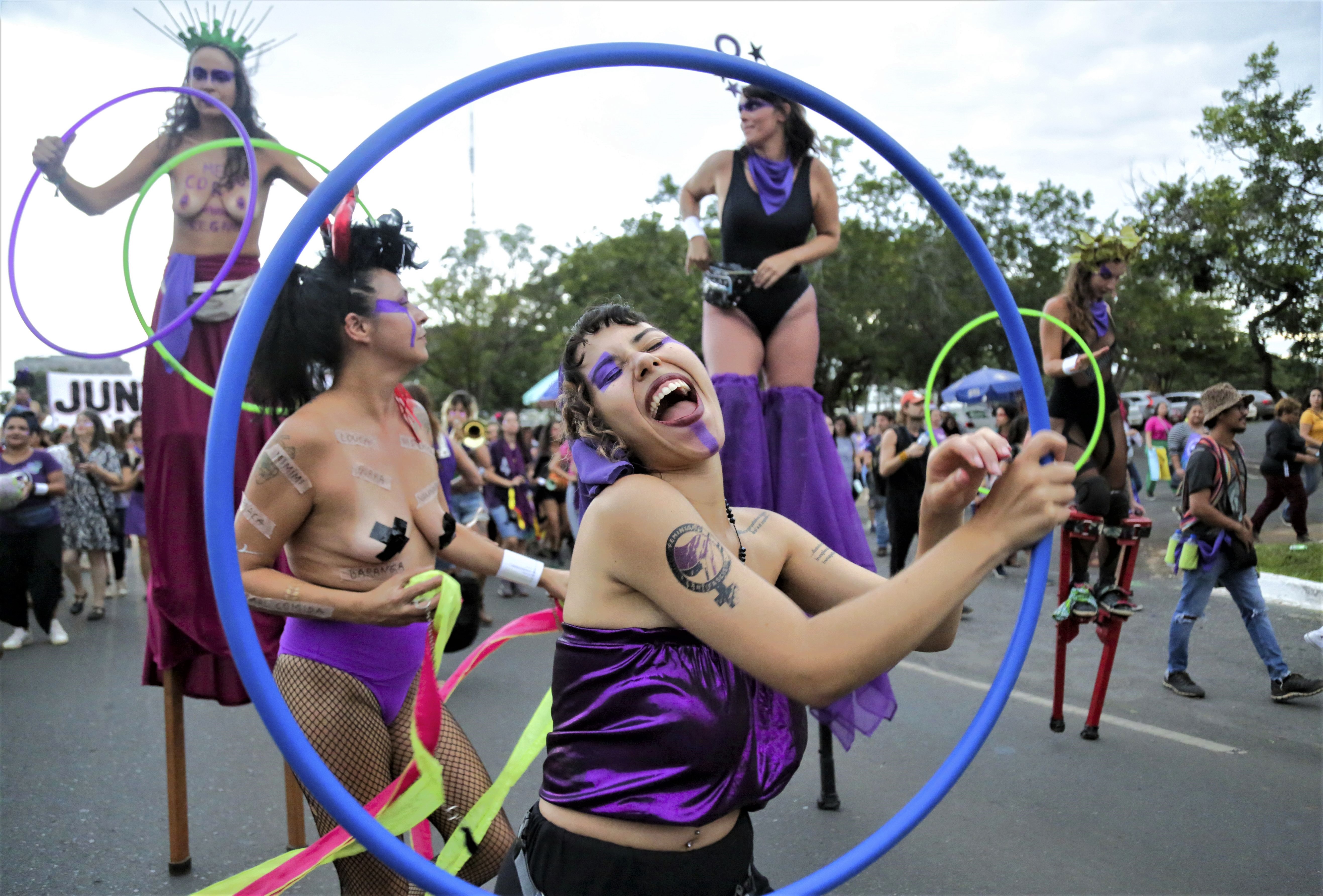 Women take part in a march marking International Women's Day, in Brasilia, Brazil, Wednesday, March 8, 2022. (Photo by Gustavo Moreno/AP Photo)