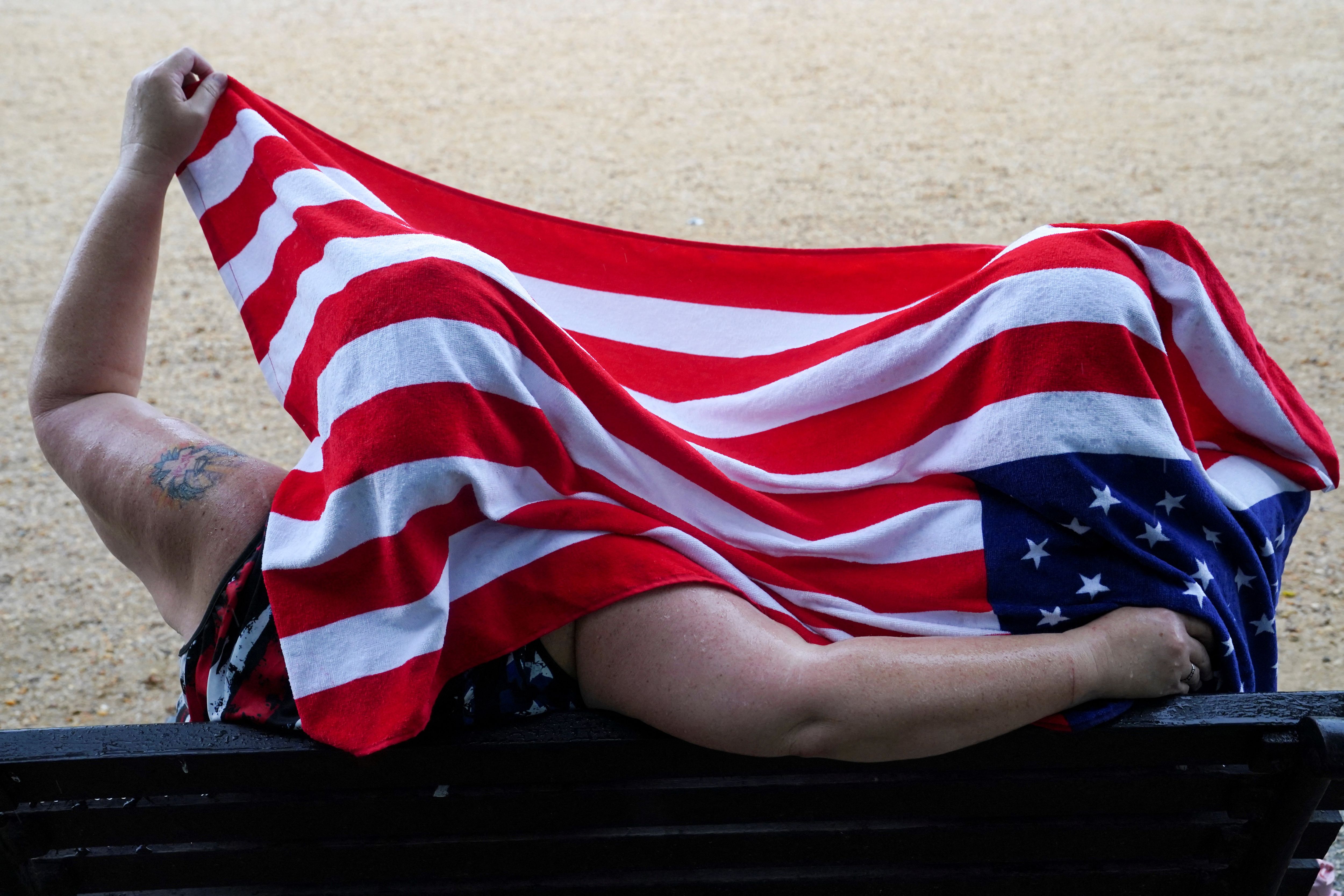 People cover themselves with an American flag towel during Fourth of July celebrations in Washington on July 4, 2024. (Photo by Nathan Howard/Reuters)