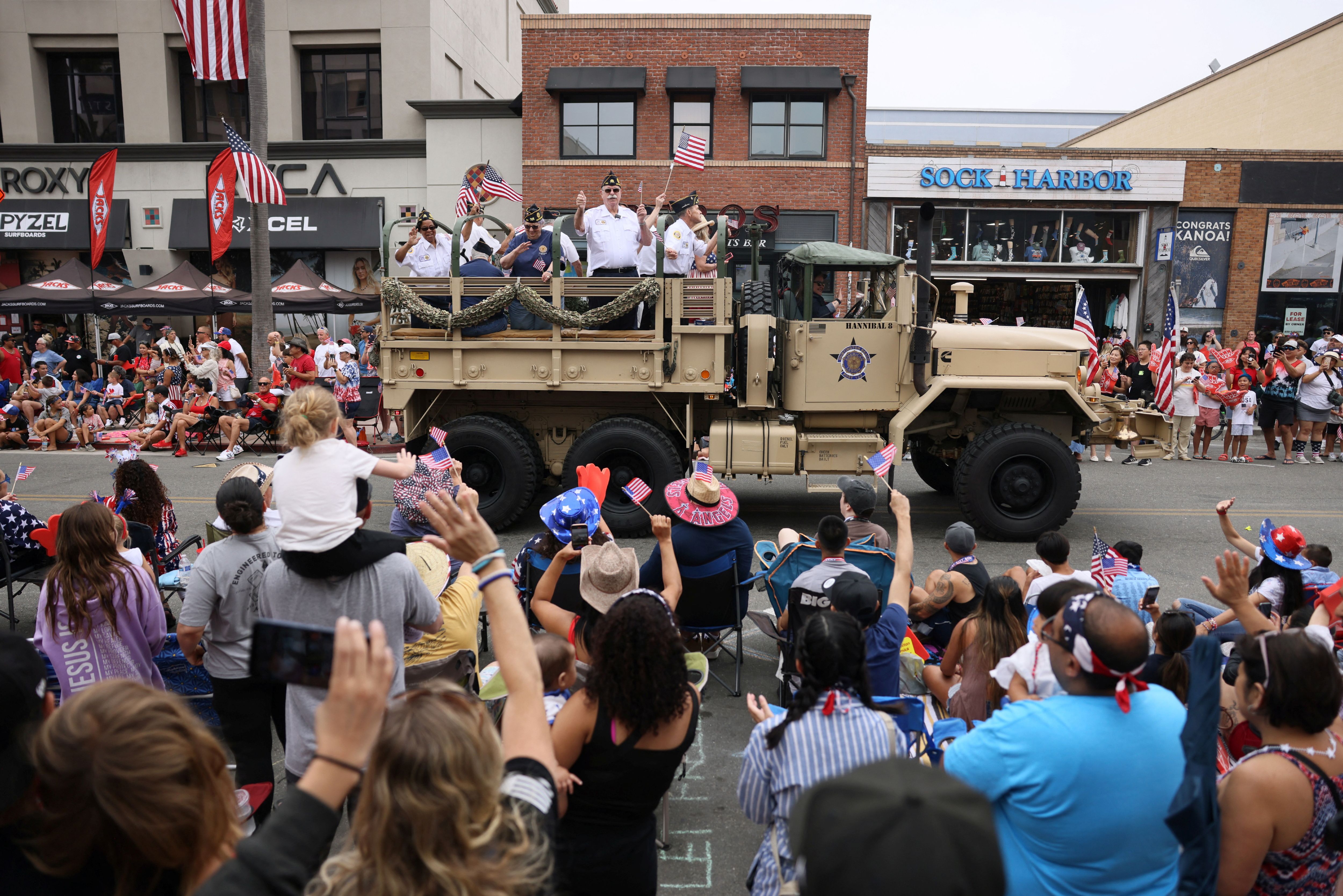 Members of the audience cheer as a truck of the American Legion, a U.S. Veterans association, participates in the Fourth of July Independence Day holiday parade during hot weather in Huntington Beach, California on July 4, 2024. (Photo by Etienne Laurent/Reuters)