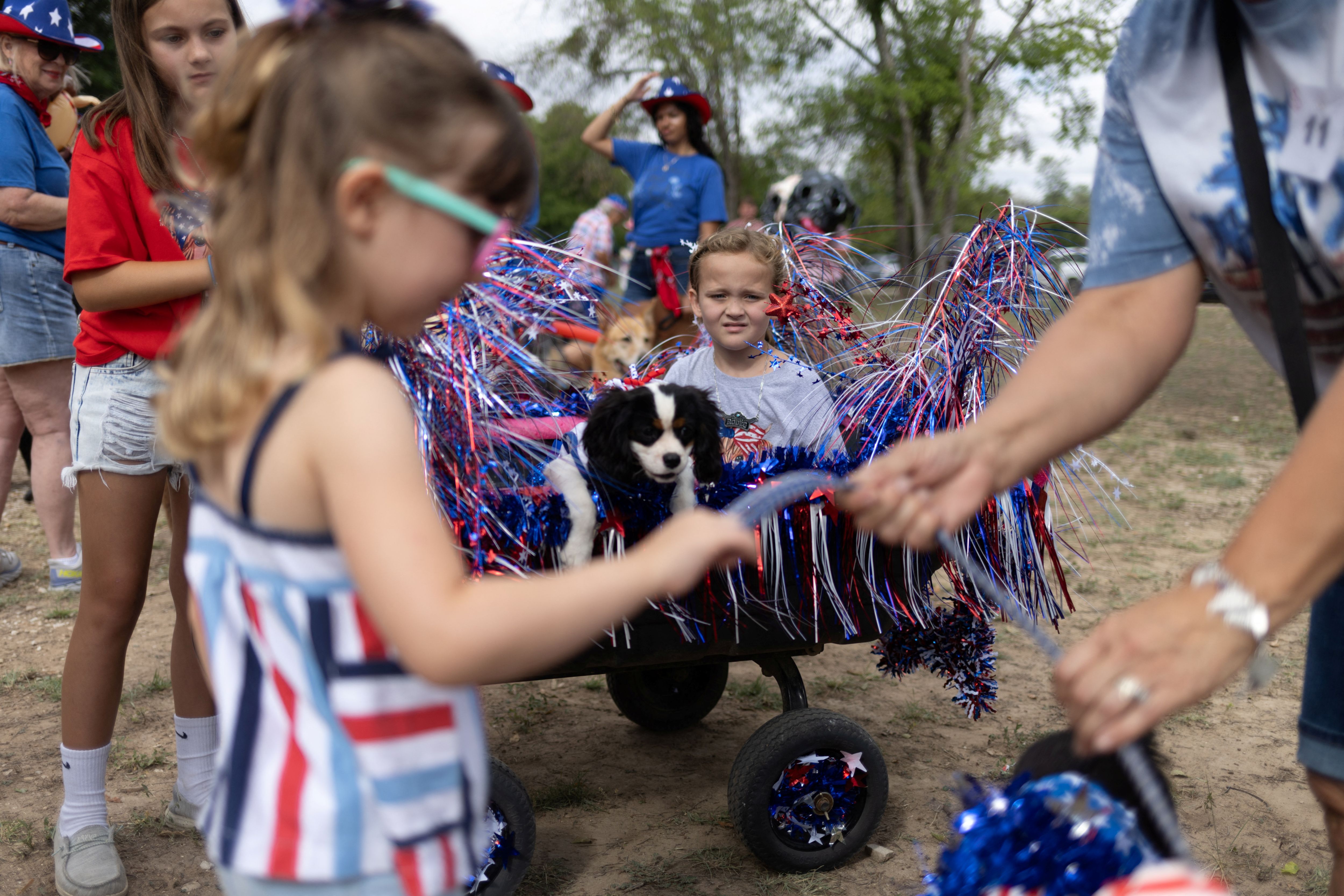 Leila Burleson, 10, watches another participant as she sits in a wagon with her Cavalier King Charles Spaniel dog Hazel during the 28th annual Pet Parade during Fourth of July Independence Day celebrations in Bandera, Texas on July 4, 2024. (Photo by Adrees Latif/Reuters)