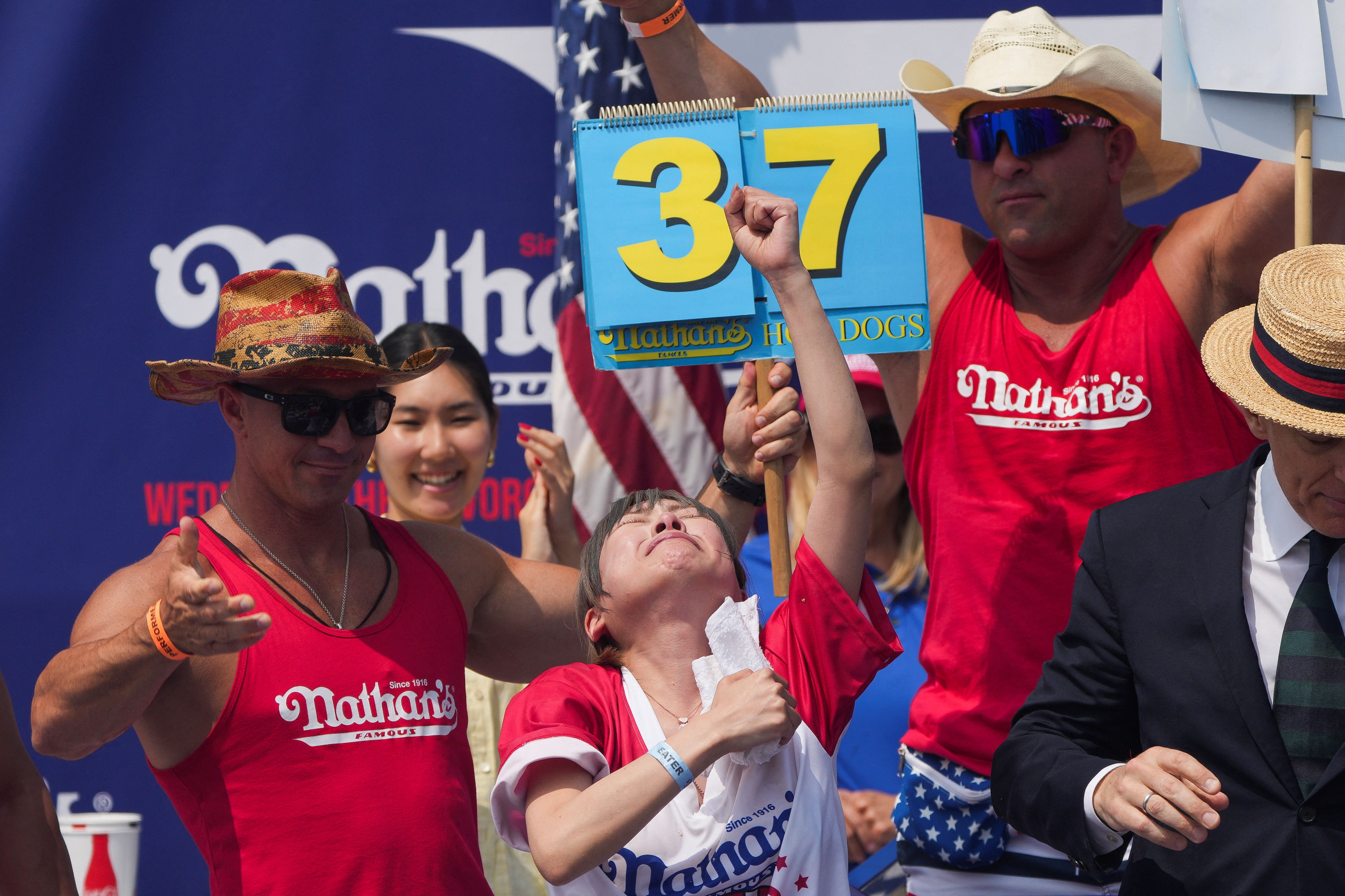 Mayoi “Ebimayo” Ebihara reacts during the 2024 Nathan's Famous Fourth of July International Hot Dog Eating Contest at Coney Island in New York City on July 4, 2024. (Photo by Jeenah Moon/Reuters)