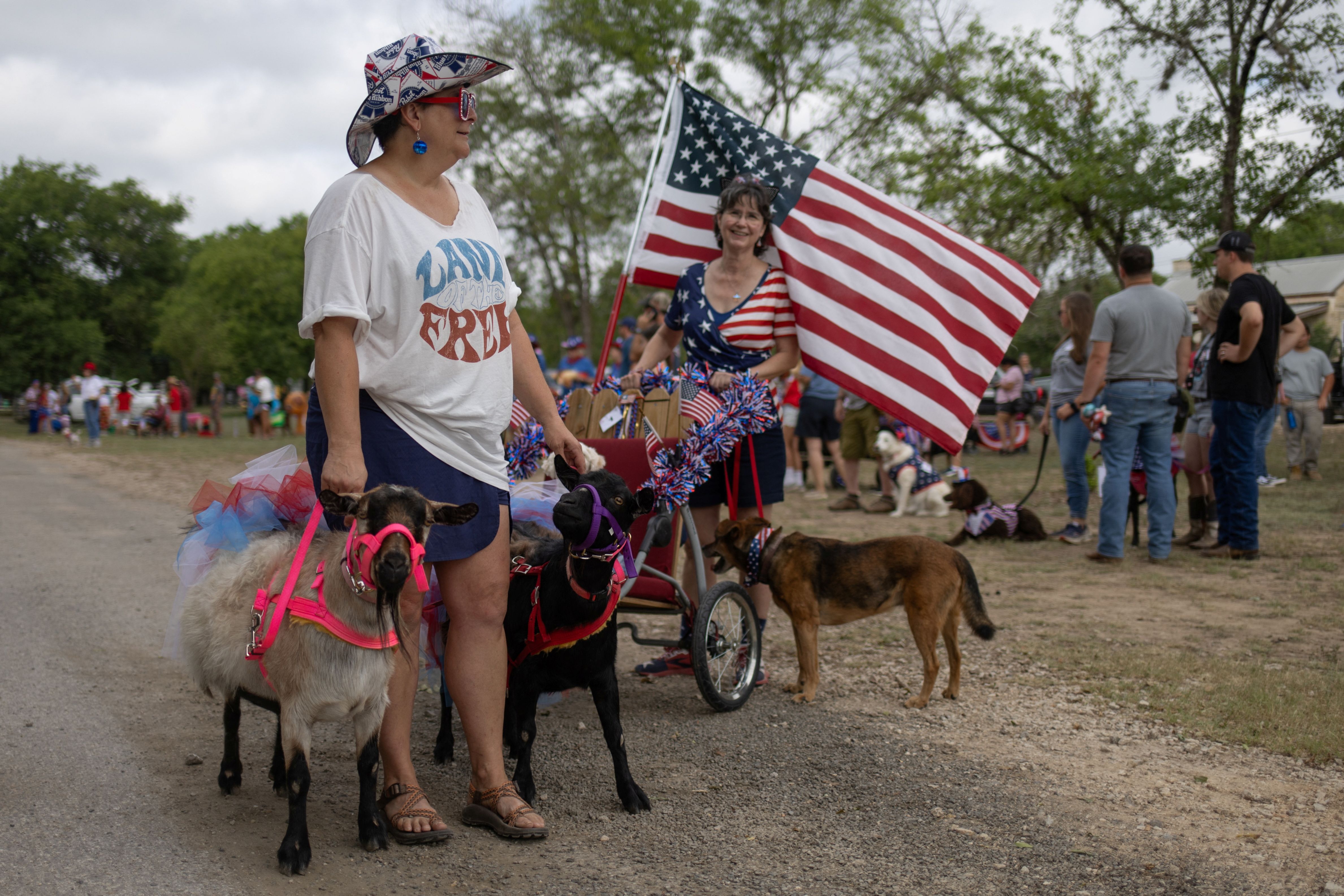 Jennifer Baine holds her three-year-old Nigora goats Pancake and Pattie at the 28th annual Pet Parade during Fourth of July Independence Day celebrations in Bandera, Texas on July 4, 2024. (Photo by Adrees Latif/Reuters)