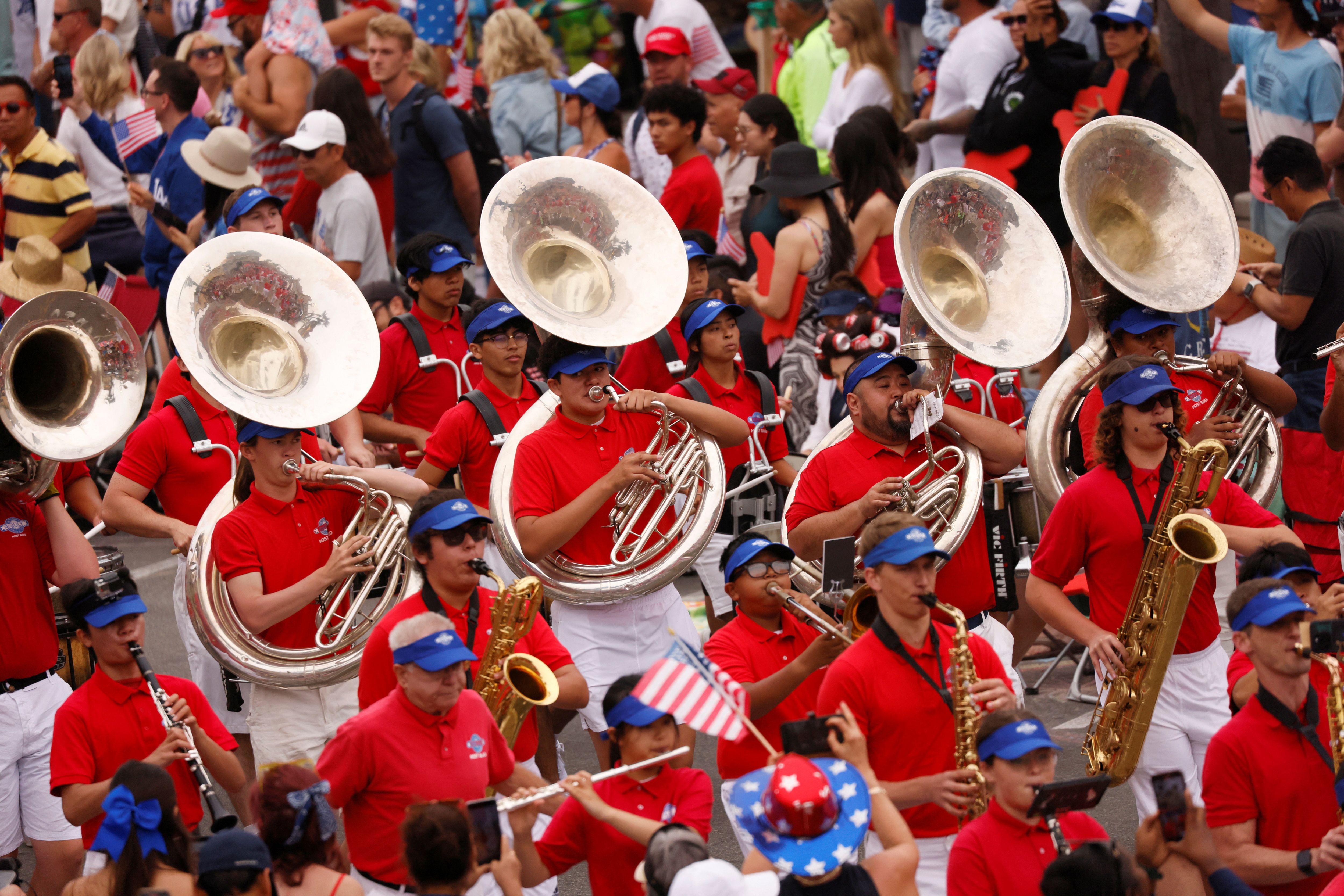A marching band participates in the Fourth of July Independence Day holiday parade during hot weather in Huntington Beach, California on July 4, 2024. (Photo by Etienne Laurent/Reuters)