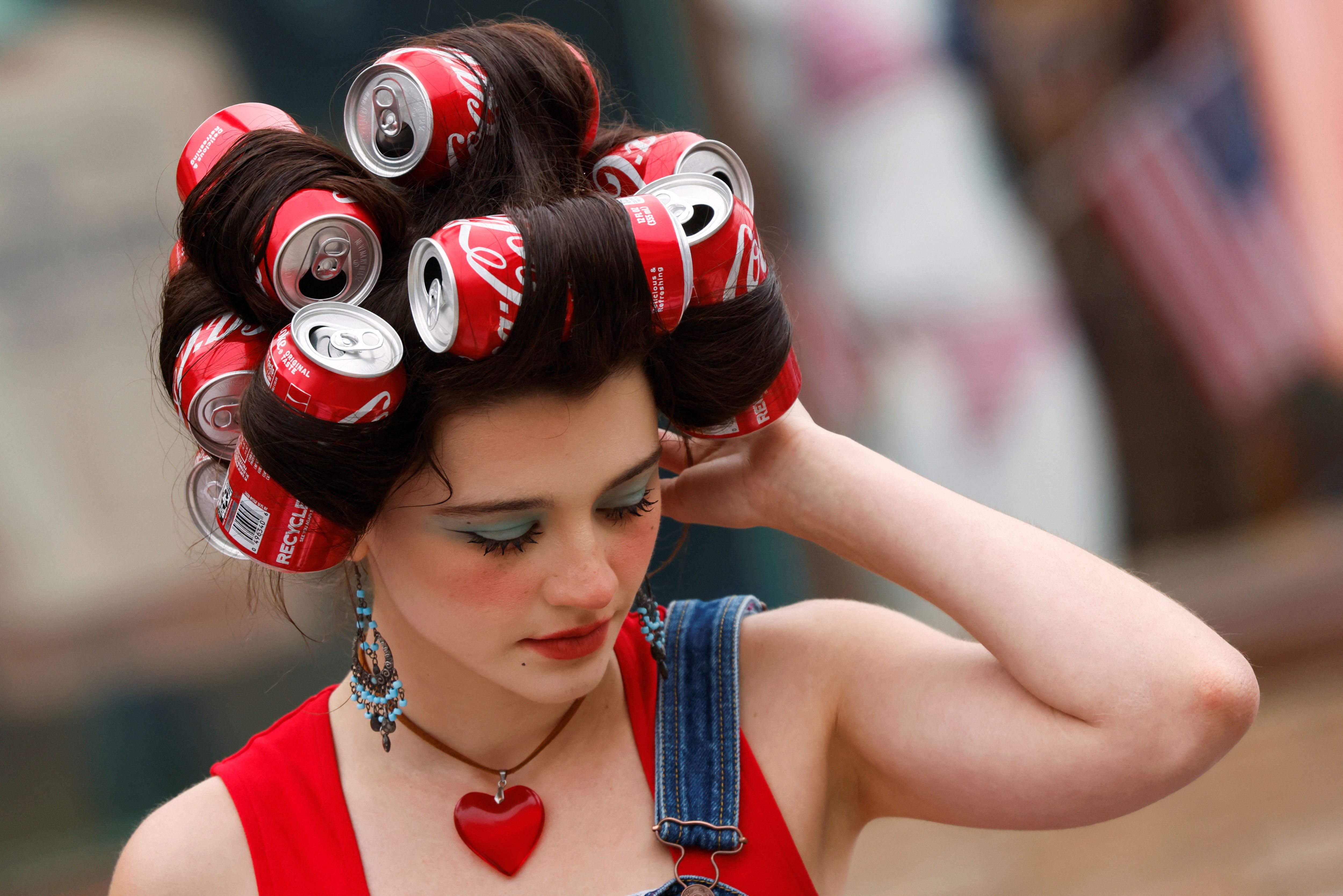 Lianah Flores with Coca Cola cans in her hair attends the Fourth of July Independence Day holiday parade during hot weather in Huntington Beach, California on July 4, 2024. (Photo by Etienne Laurent/Reuters)