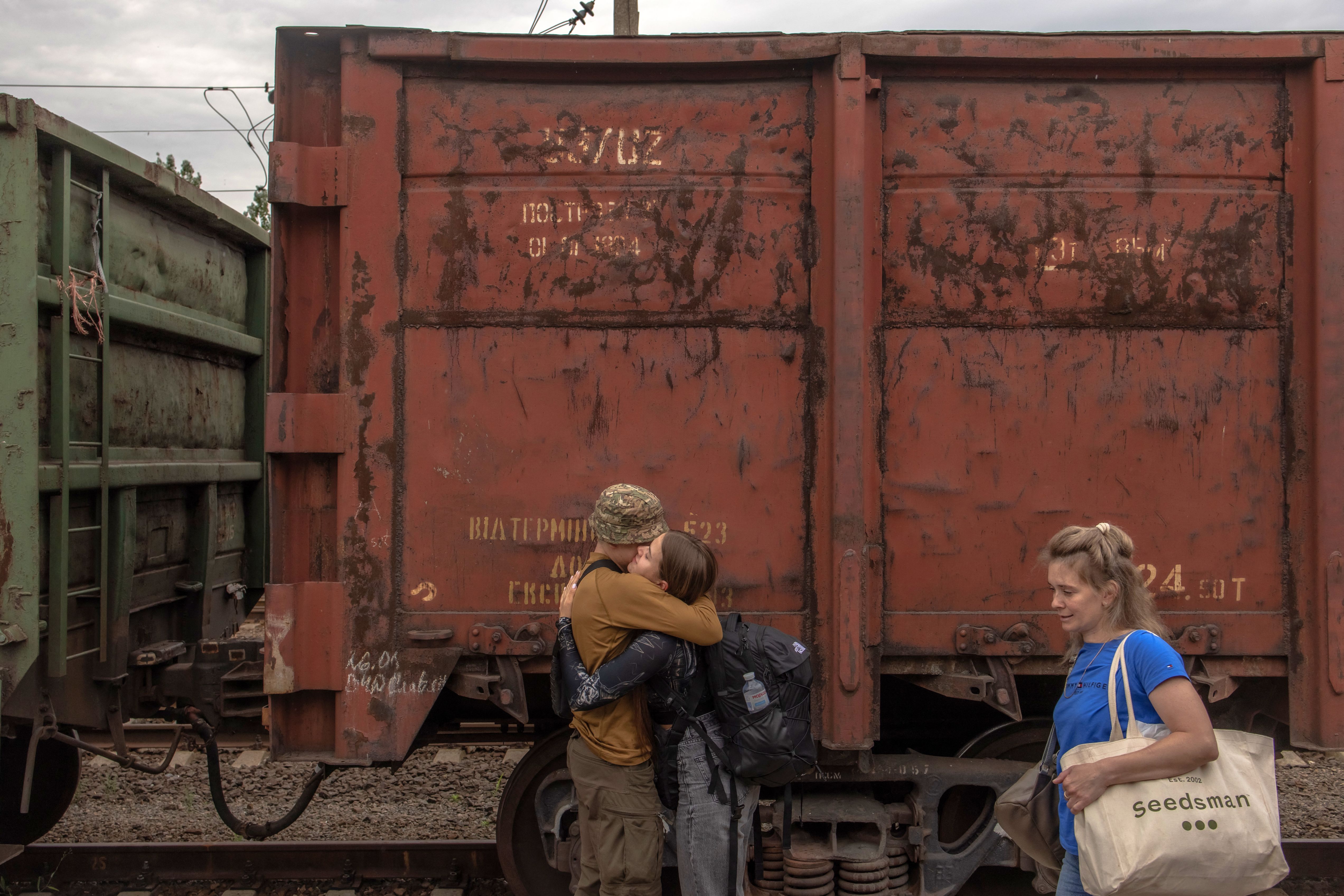 A Ukrainian serviceman hugs his partner who arrived on a train from Kyiv, at a railway station in Kramatorsk, Donetsk region, on June 15, 2024, amid the Russian invasion of Ukraine. (Photo by Roman Pilipey/AFP Photo)