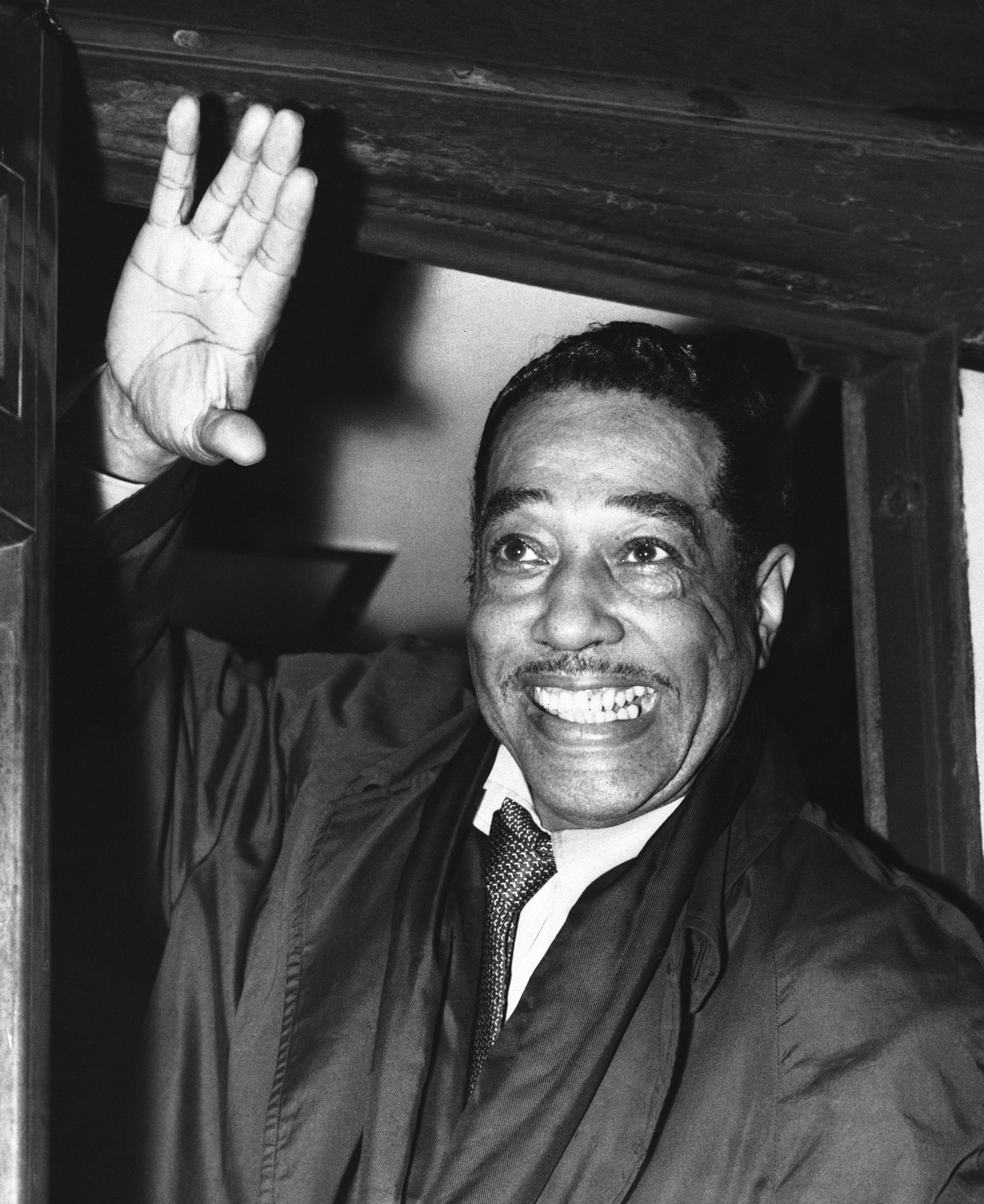 Duke Ellington waves to fans on arrival at London's Paddington Station, October 3, 1958 after traveling from Plymouth on the boat train from the S.S. Ill Del France. He is scheduled to play his first concert of his forthcoming tour at the Royal Festival Hall, London on October 5. (Photo by AP Photo)