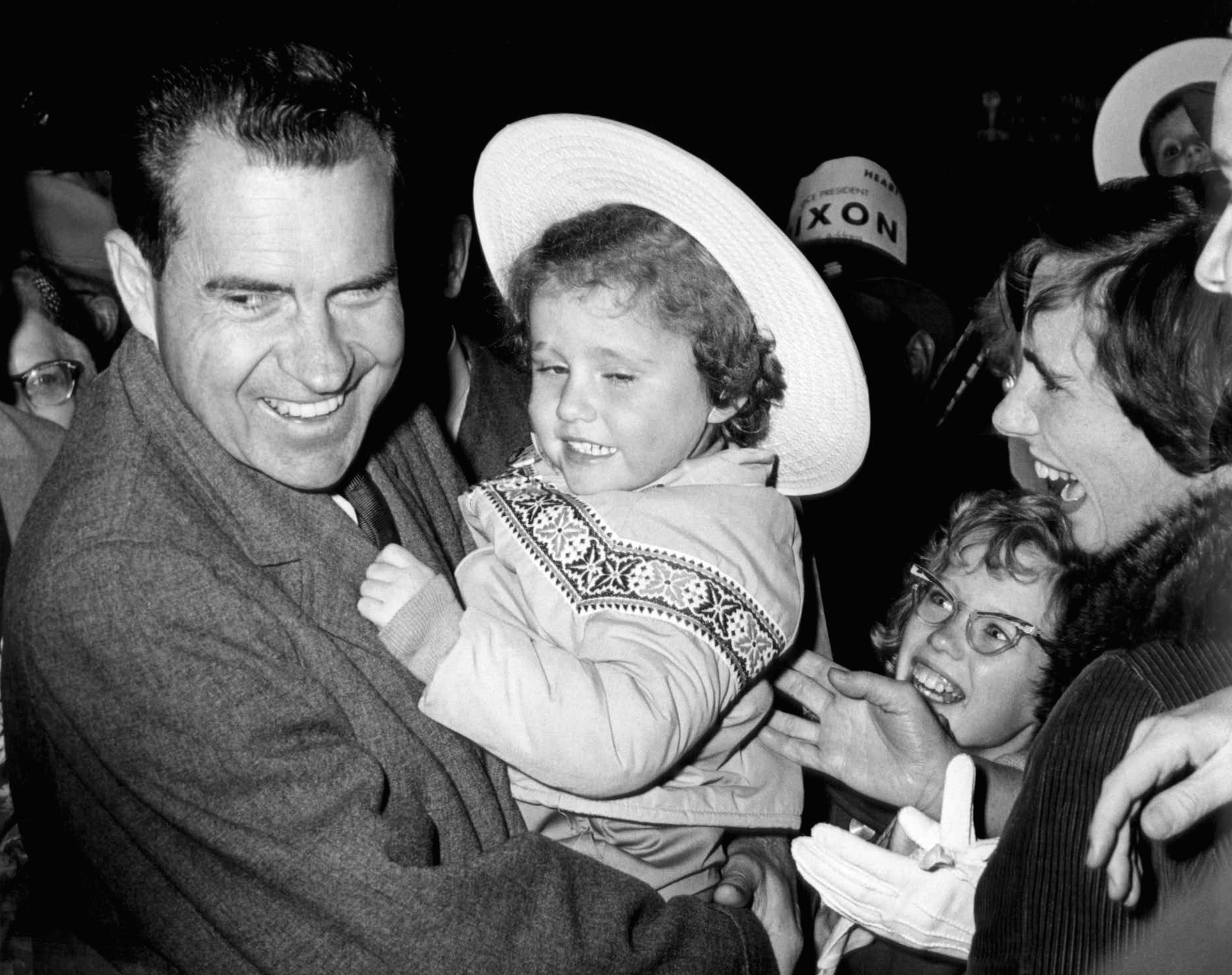 Vice President Richard M. Nixon is shown carrying an unidentified child at Pennsylvania Station in Pittsburgh, PA on October 24, 1960. (Photo by AP Photo)