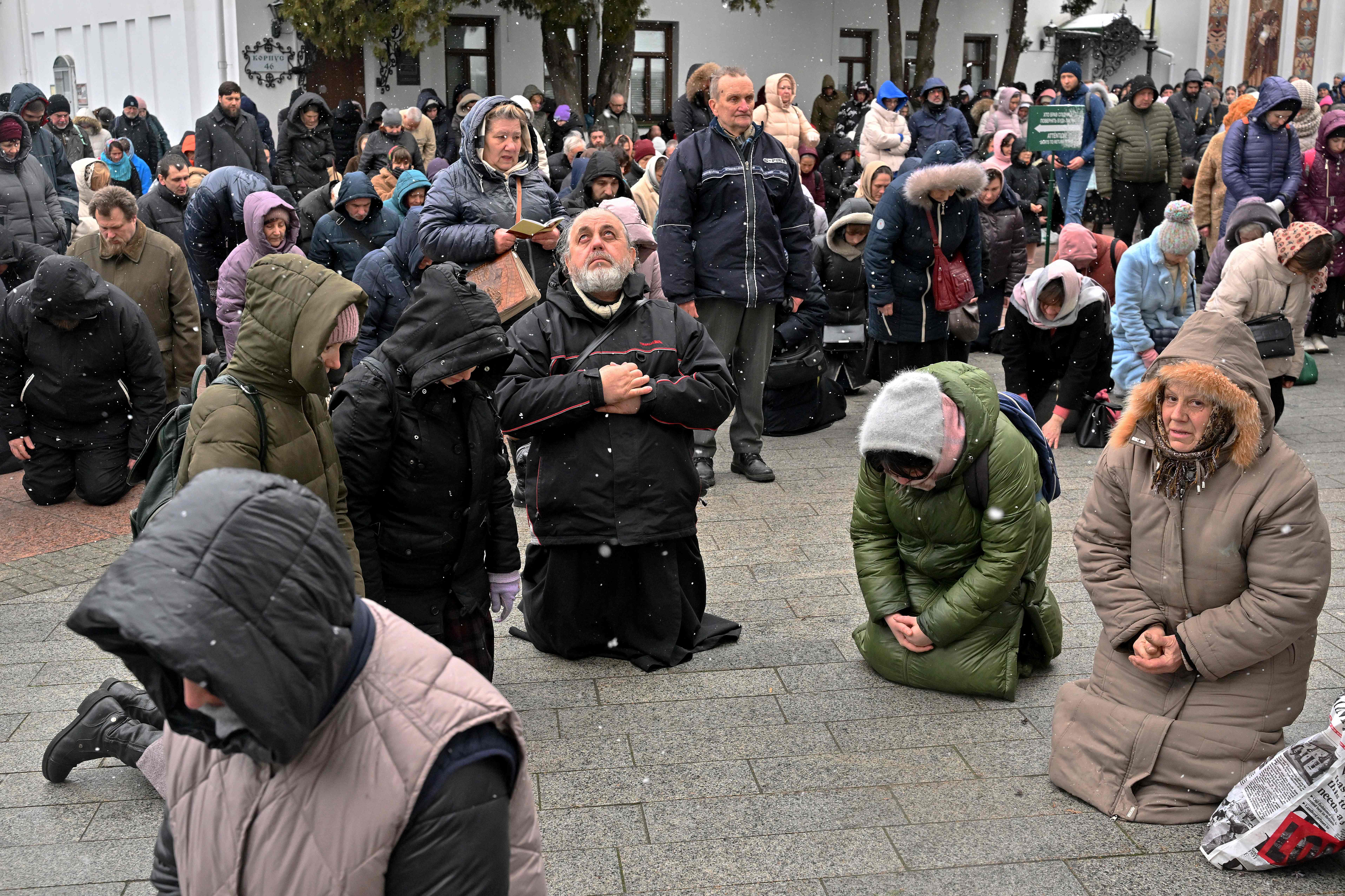 Believers of the Ukrainian Orthodox Church pray at the historic Kyiv-Pechersk Lavra in Kyiv on March 29, 2023. Hundreds of worshippers attended a service on March 29, 2023 at a historic Kyiv monastery accused of maintaining links with Moscow as the deadline for the eviction of its monks dawned. The government announced it was terminating the lease that allowed the monks to occupy part of the Kyiv-Pechersk Lavra for free, giving them until March 29 to leave. (Photo by Sergei Supinsky/AFP Photo)