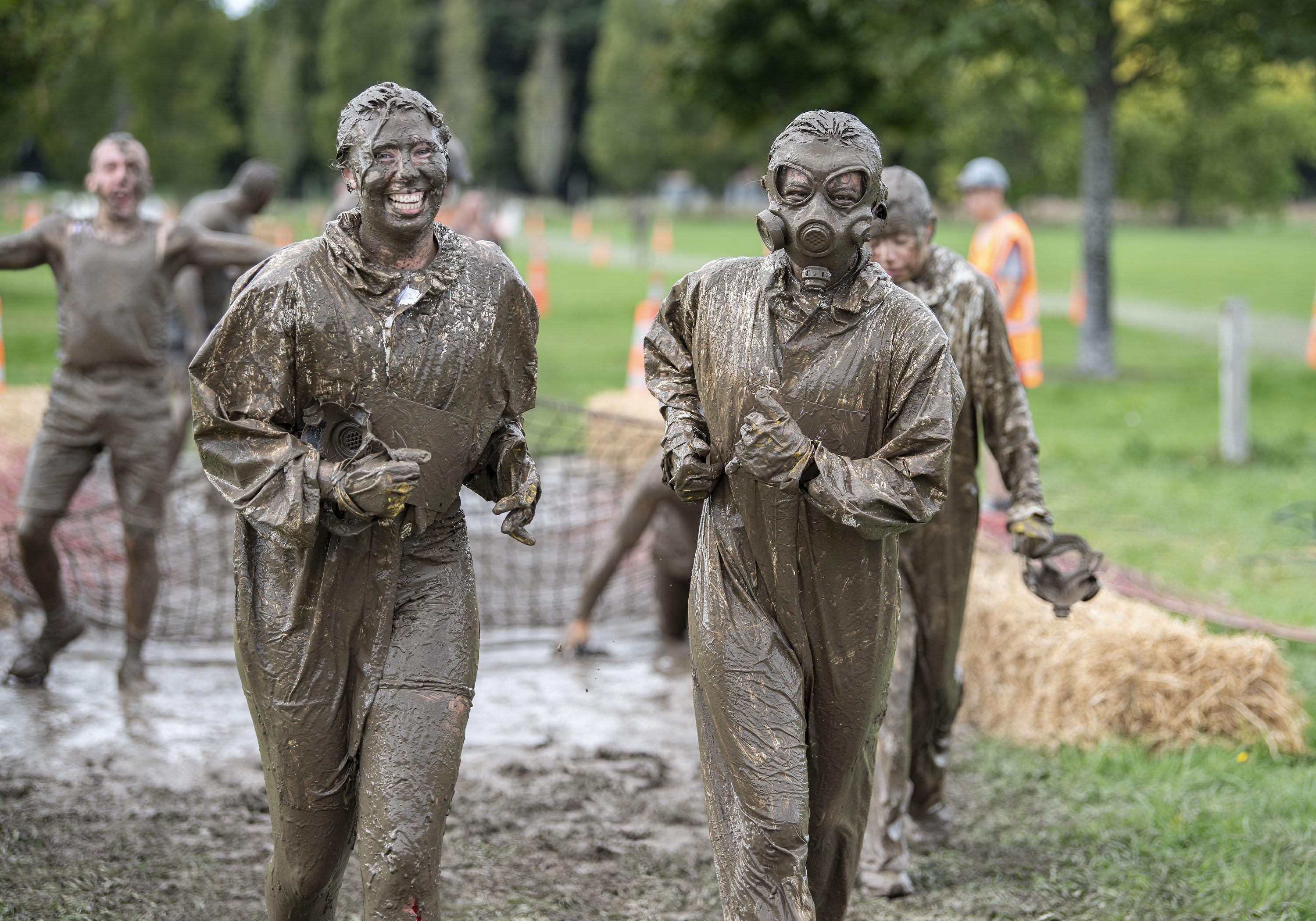 Children and adults compete in a Muddy Good Run, an event which includes having them crawl through mud pits, climb over cars, crawl through mud under two vehicles and jump in and out of containers filled with water in Christchurch, New Zealand on March 26, 2023. (Photo by P.J. Heller/Zuma Press Wire/The Mega Agency)