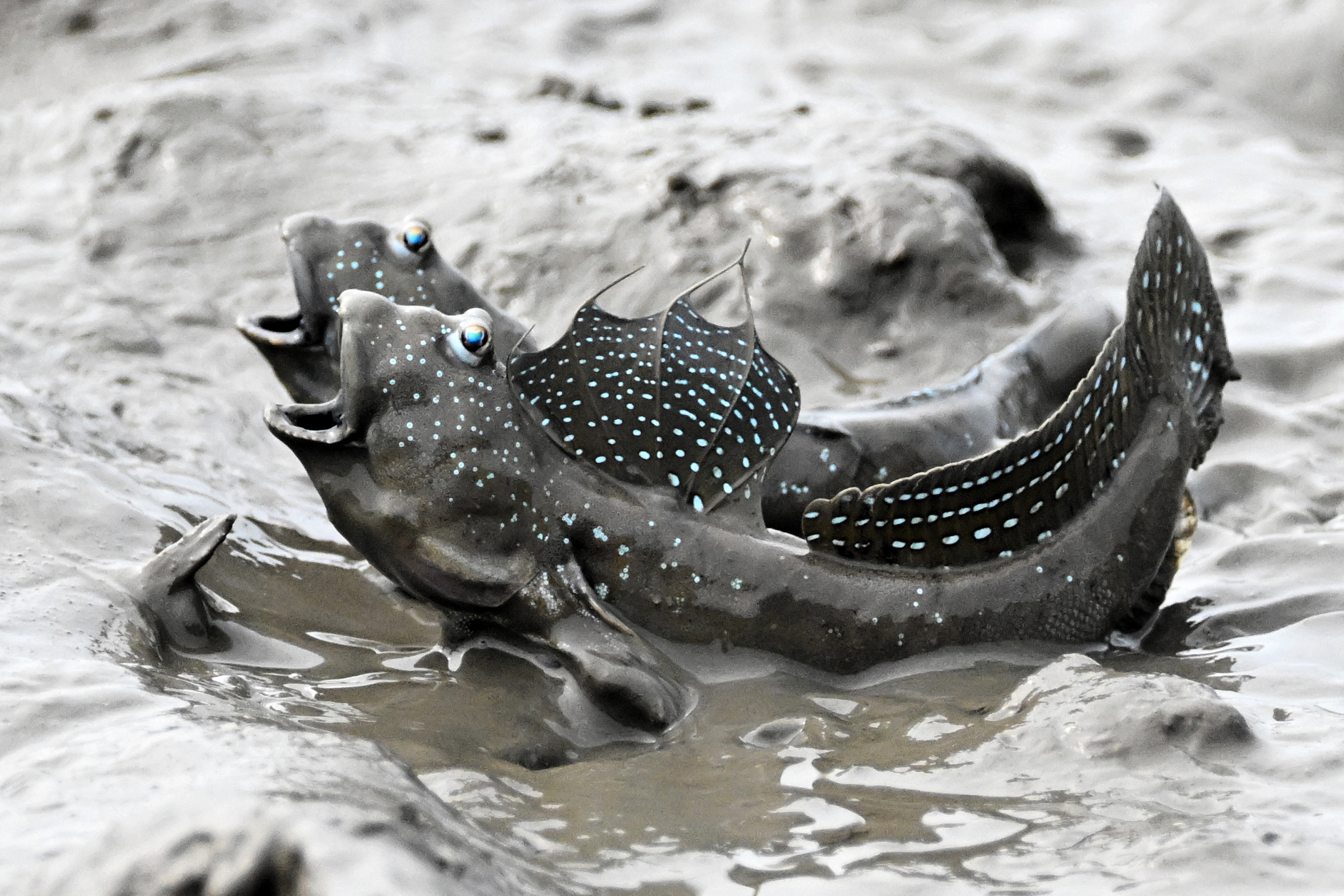 Male blue spotted mudskippers battle in breeding season at Ariake Sea on June 14, 2024 in Ogi, Saga, Japan. (Photo by The Asahi Shimbun via Getty Images)
