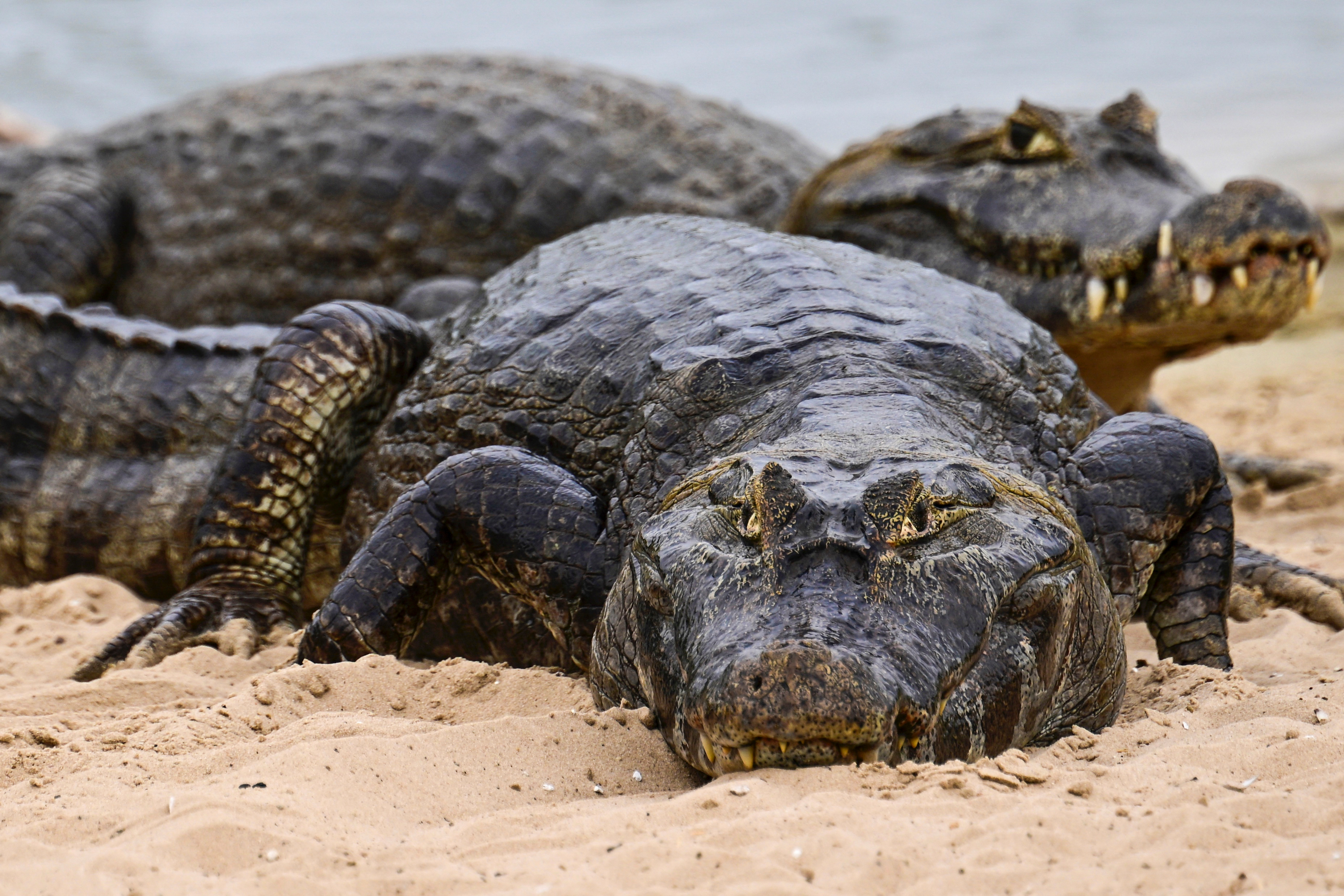Black caimans (Yacare caiman) are pictured near the road a few kilometers from Porto Esperanca, in the municipality of Corumba, Mato Grosso do Sul State, Brazil, on June 25, 2024. (Photo by Pablo Porciuncula/AFP Photo)