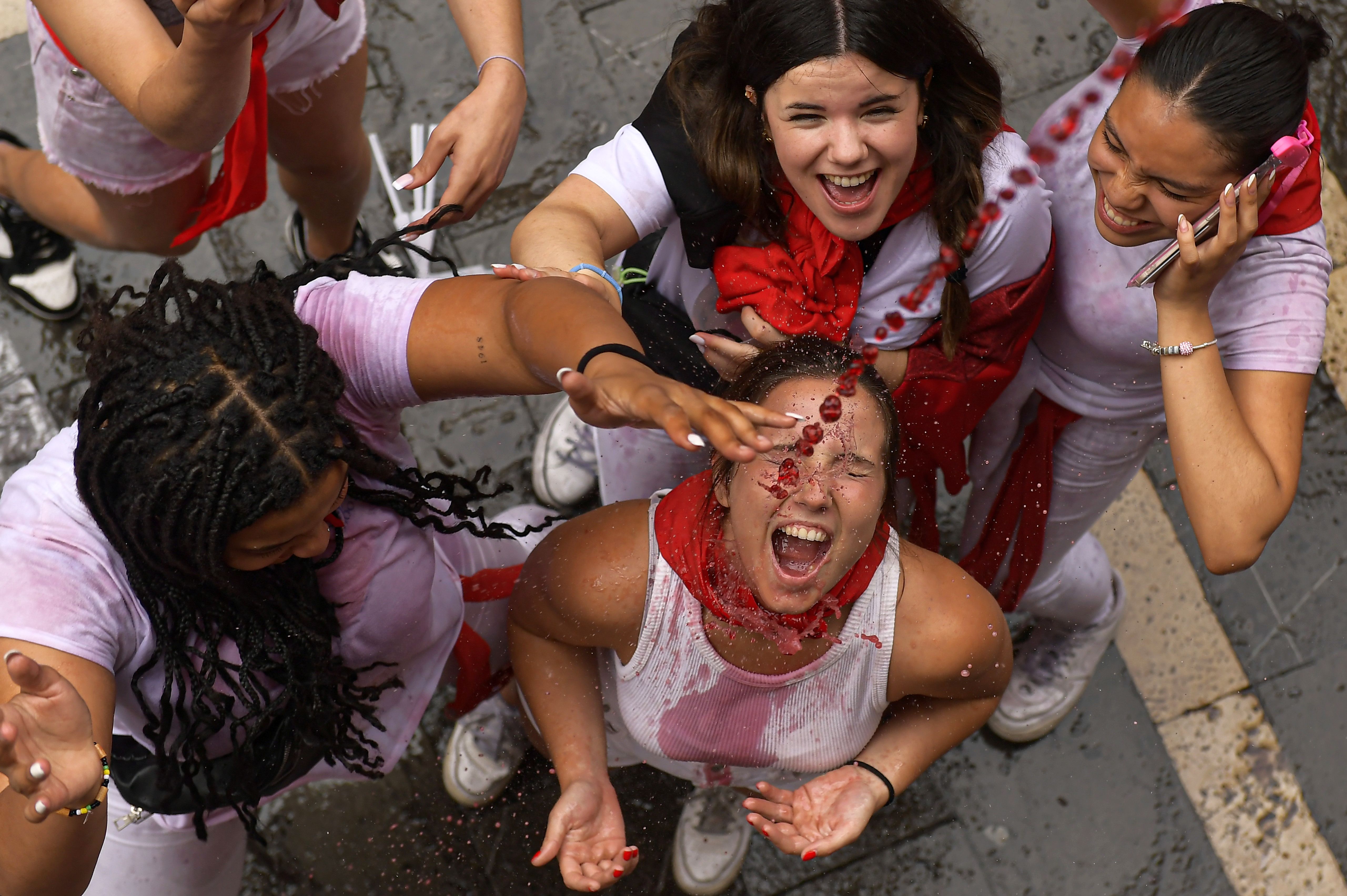 A reveler drinks wine as she attends the official start of nine days of uninterrupted partying in Pamplona's famed running-of-the-bulls festival in Pamplona, Spain, Saturday, July 6, 2024. (Photo by Alvaro Barrientos/AP Photo)