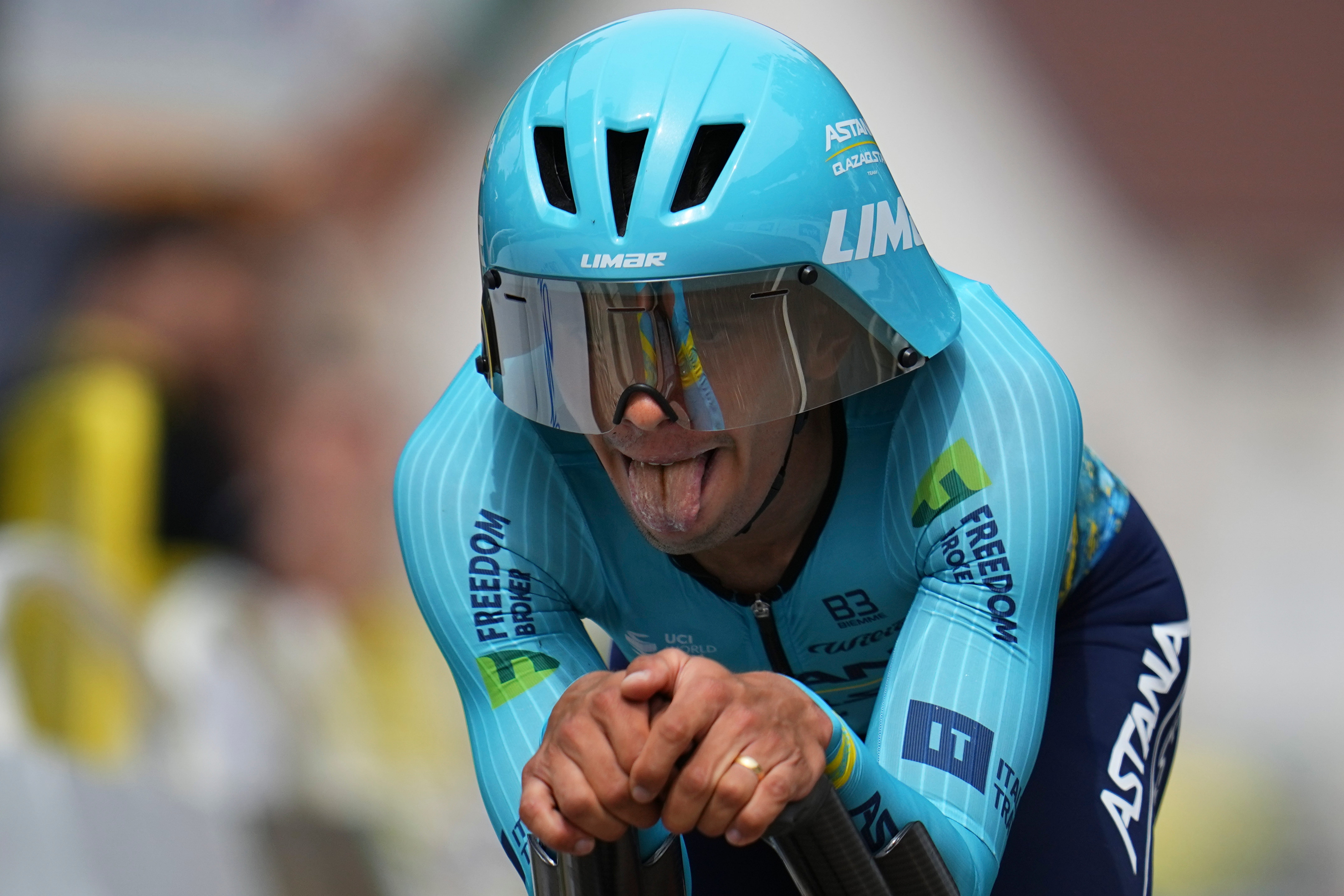 Colombia's Harold Tejada strains during the seventh stage of the Tour de France cycling race, an individual time-trial over 25.3 kilometers (15.7 miles) with start Nuits-Saint-Georges and finish in Gevrey-Chambertin, France, Friday, July 5, 2024. (Photo by Daniel Cole/AP Photo)