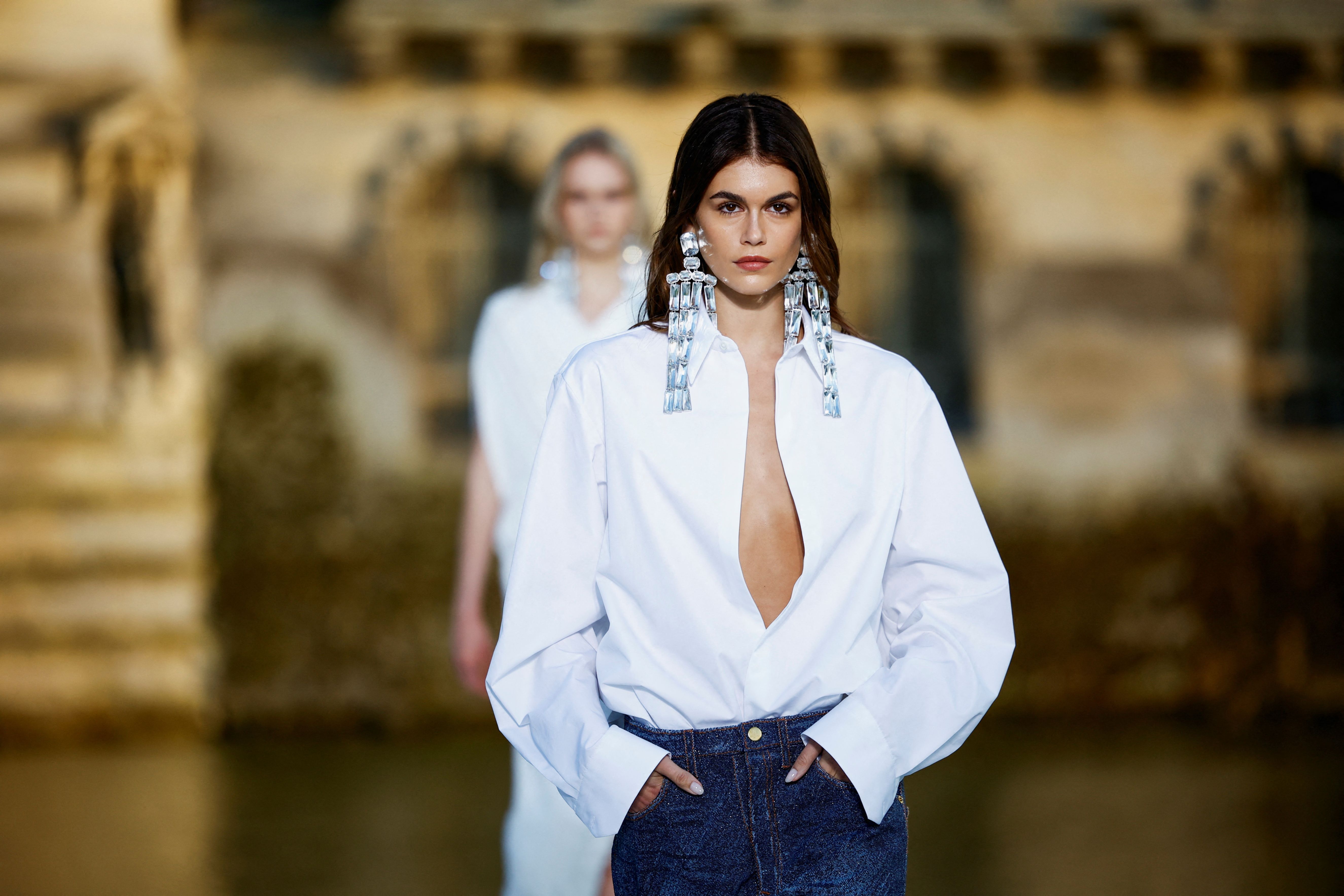 Kaia Gerber presents a creation by designer Pierpaolo Piccioli as part of his Haute Couture Fall/Winter 2023-2024 collection show for fashion house Valentino at the Chateau de Chantilly near Paris, France on July 5, 2023. (Photo by Sarah Meyssonnier/Reuters)