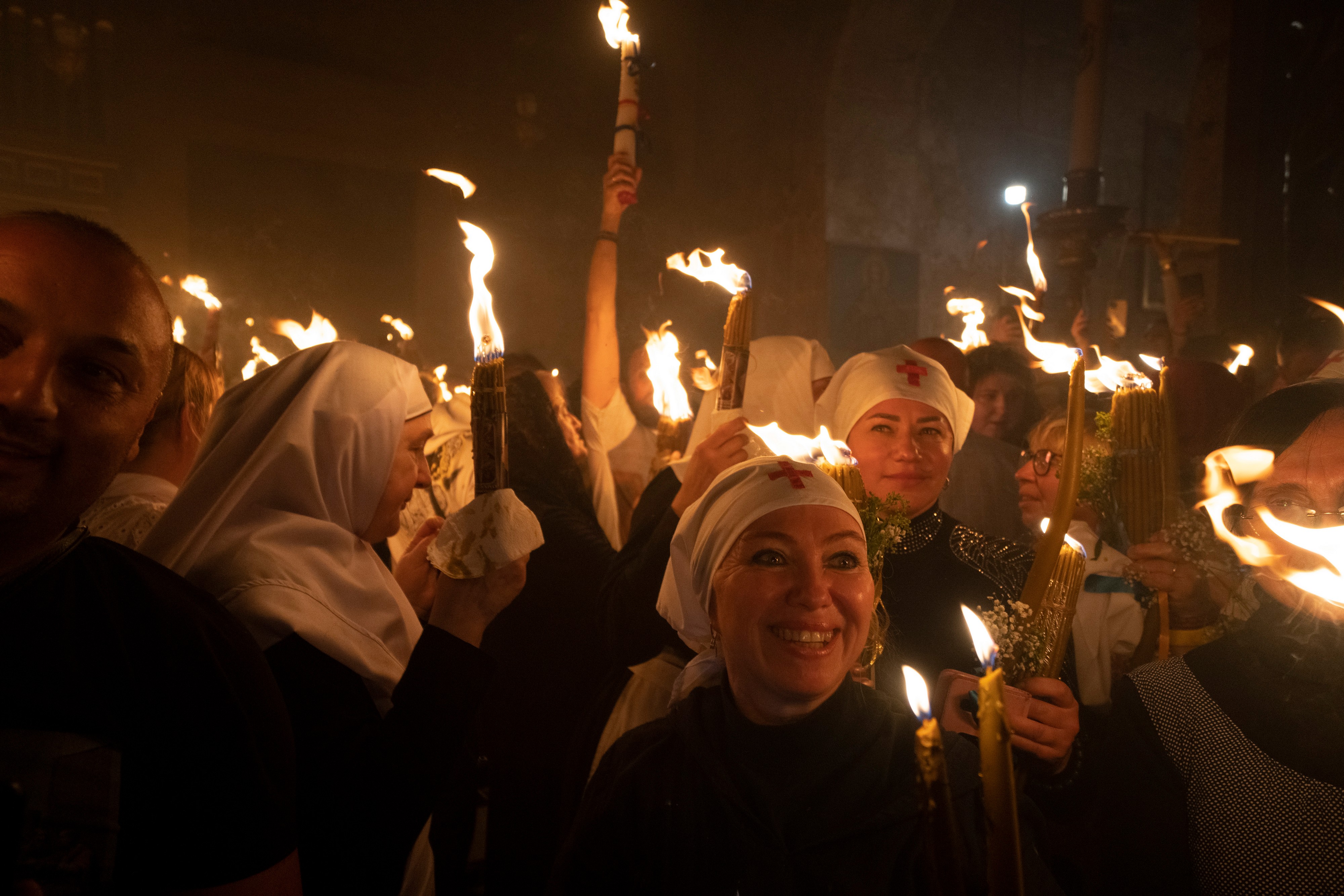 Christian Orthodox pilgrims hold candles during the Holy Fire ceremony at the Church of the Holy Sepulchre, where many Christians believe Jesus was crucified, buried and rose from the dead, in the Old City of Jerusalem, Saturday, May 4, 2024. In the annual ceremony that has been observed for over a millennium, a flame taken from Jesus' tomb is used to light the candles of fervent believers of Christian Orthodox communities near and far. The devout believe the origin of the flame is a miracle and is shrouded in mystery. (Photo by Leo Correa/AP Photo)