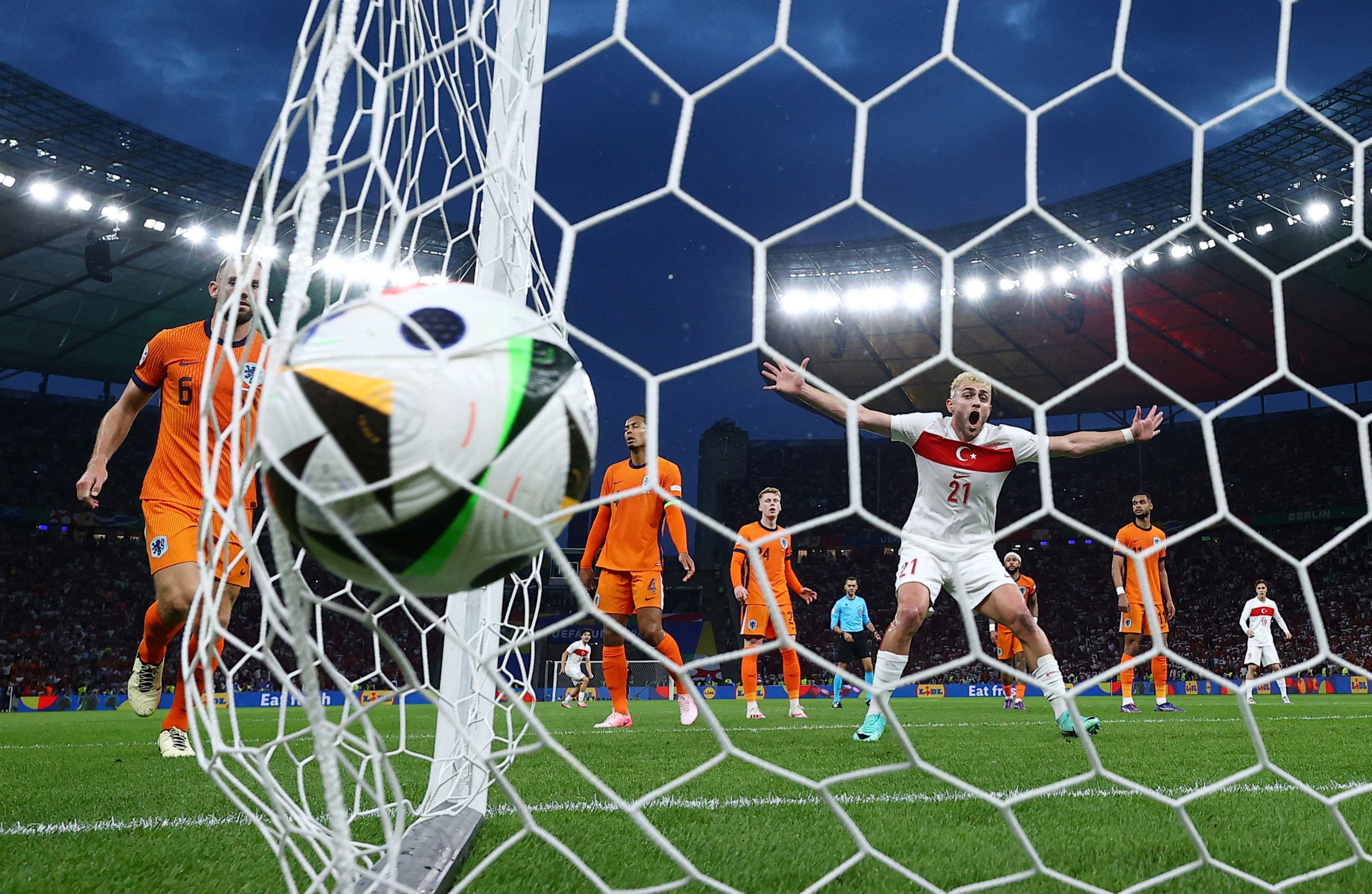 Turkey's Baris Alper Yilmaz celebrates after Samet Akaydin scores their first goal against Netherlands in Berlin on July 6, 2024. (Photo by Annegret Hilse/Reuters)
