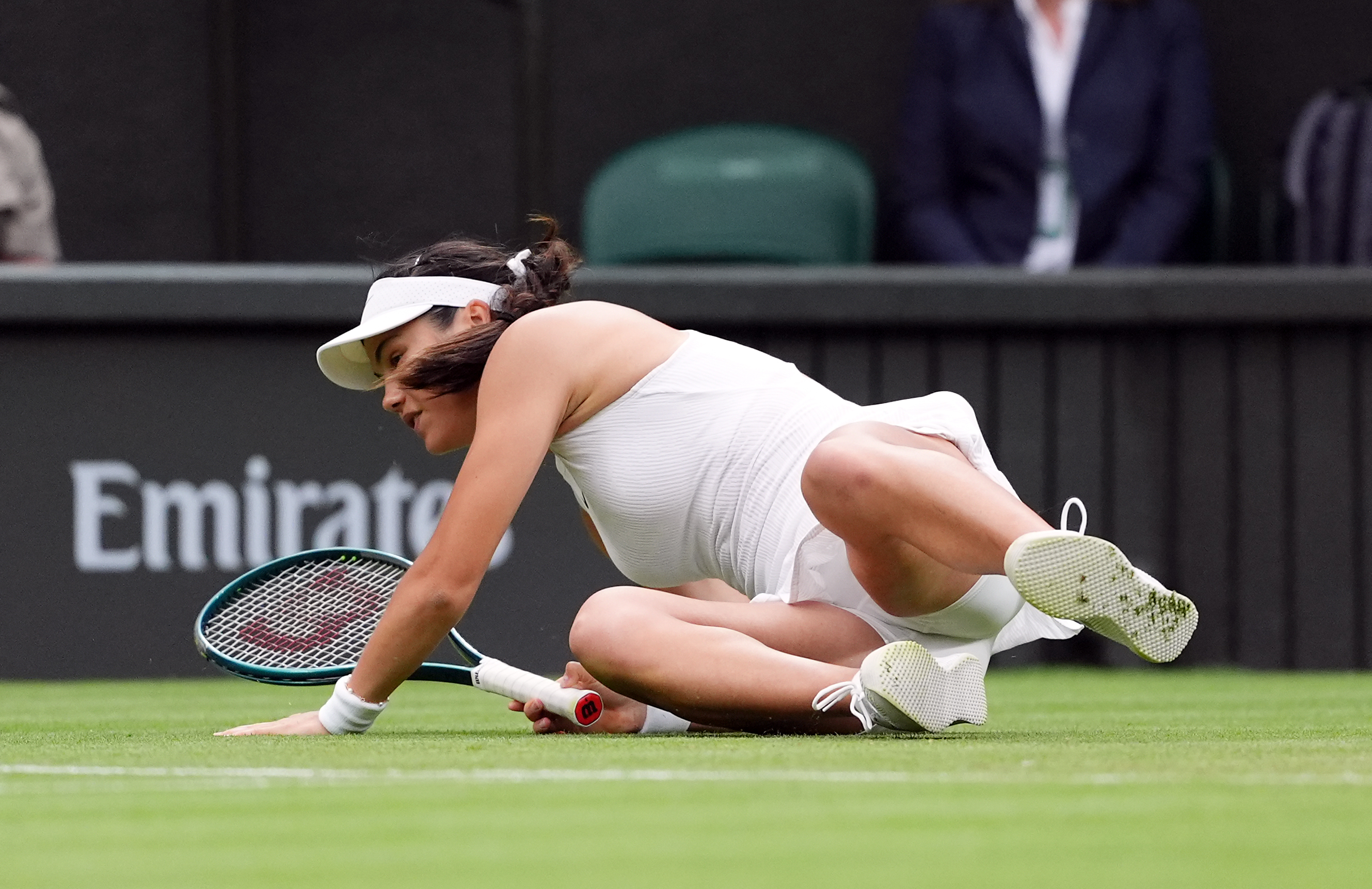 Emma Raducanu slips during her match against Lulu Sun (not pictured) on day seven of the 2024 Wimbledon Championships at the All England Lawn Tennis and Croquet Club, London on Sunday, July 7, 2024. (Photo by John Walton/PA Images via Getty Images)