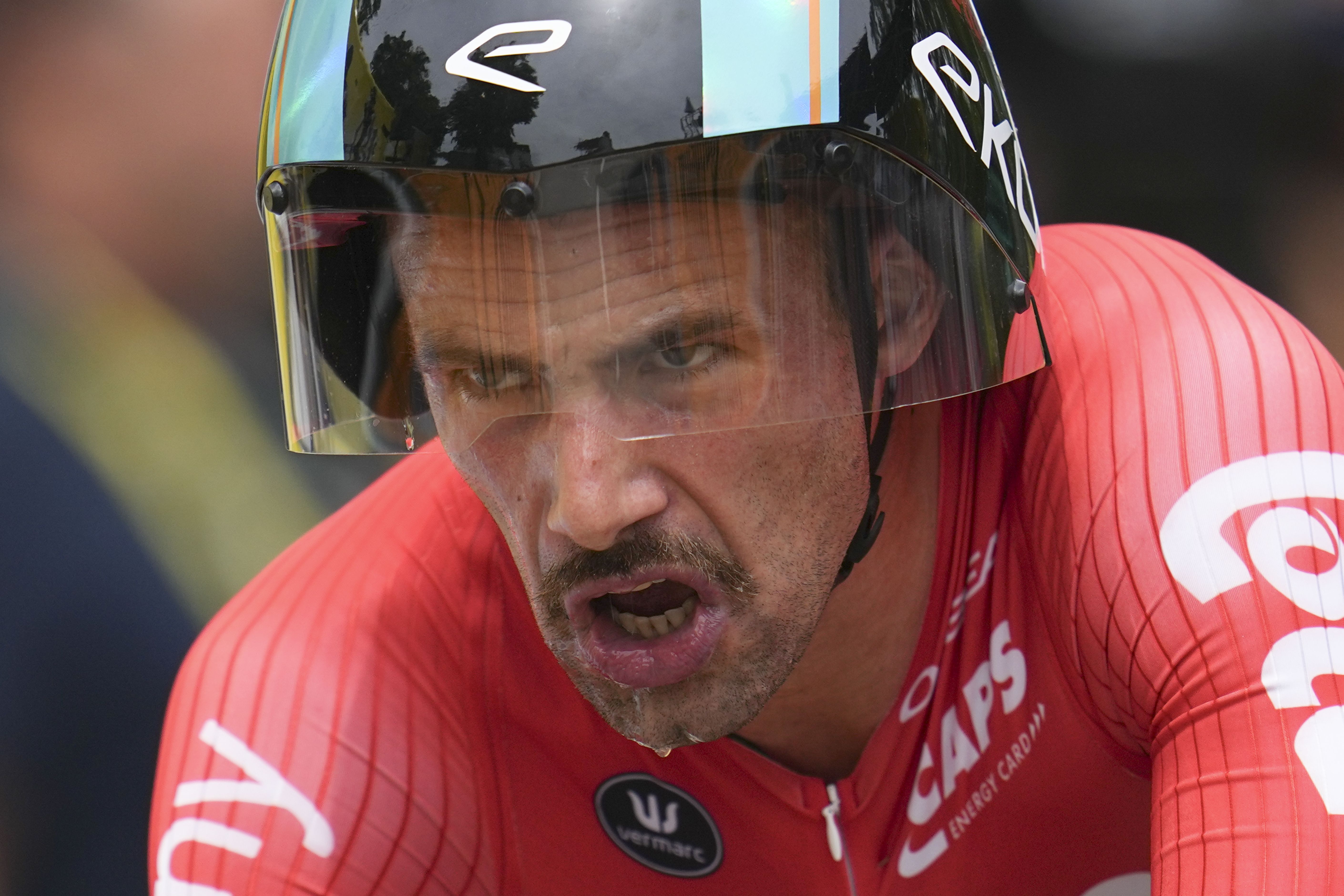Belgium's Victor Campenaerts strains during the seventh stage of the Tour de France cycling race, an individual time-trial over 25.3 kilometers (15.7 miles) with start Nuits-Saint-Georges and finish in Gevrey-Chambertin, France, Friday, July 5, 2024. (Photo by Daniel Cole/AP Photo)